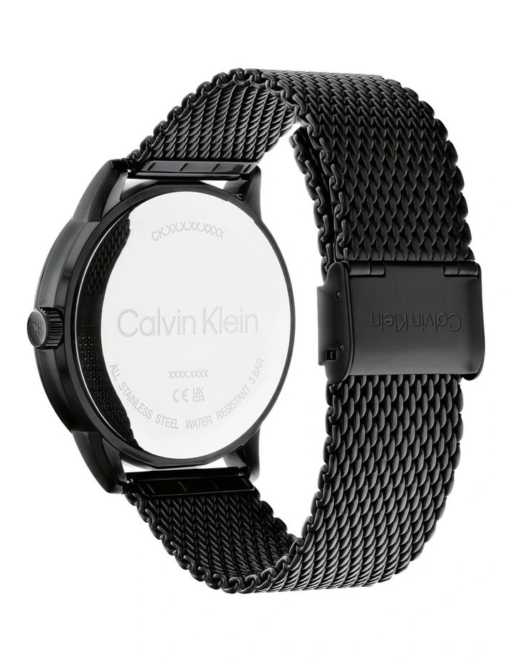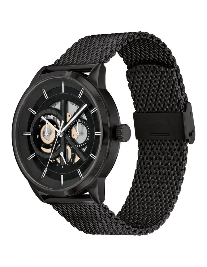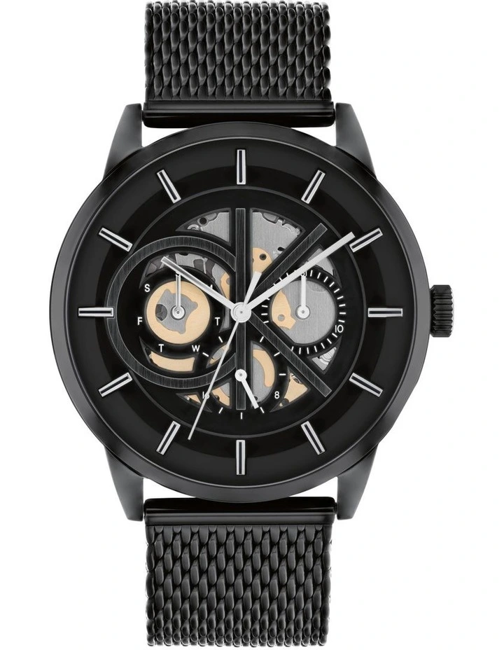Architectural sophistication. Multi-layered dial featuring the Calvin Klein acronym with exposed multi-functional movement. Available on a bold mesh bracelet.