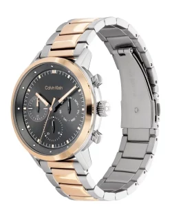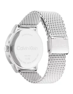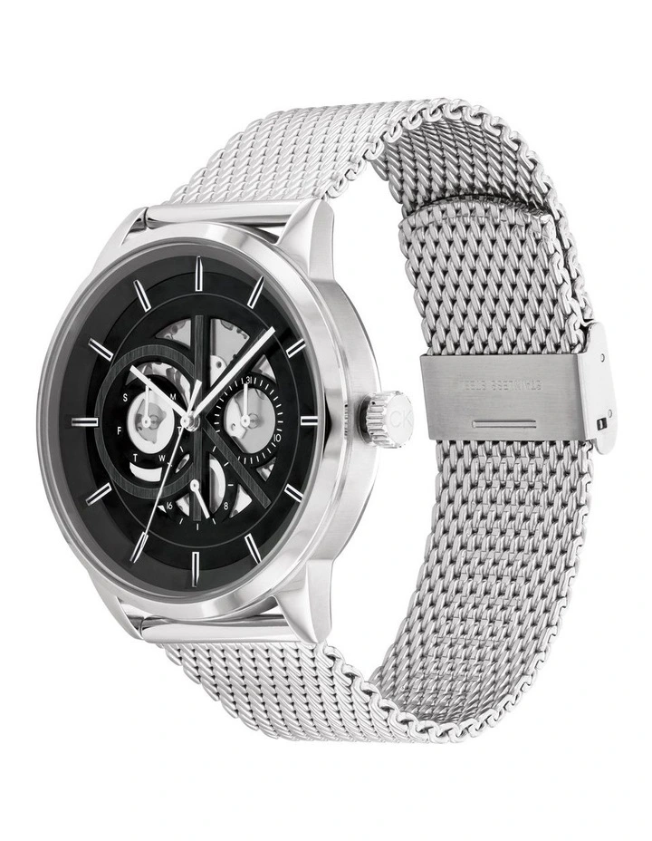 Architectural sophistication. Multi-layered dial featuring the Calvin Klein acronym with exposed multi-functional movement. Available on a bold mesh bracelet.