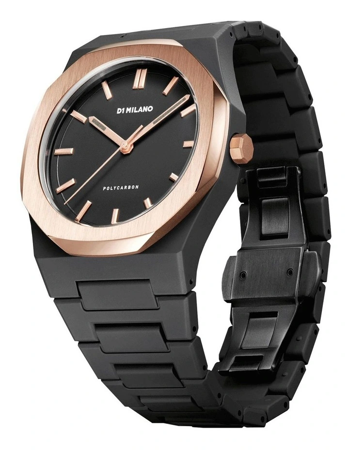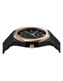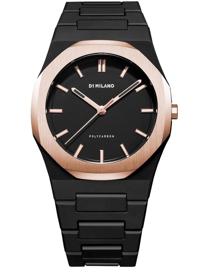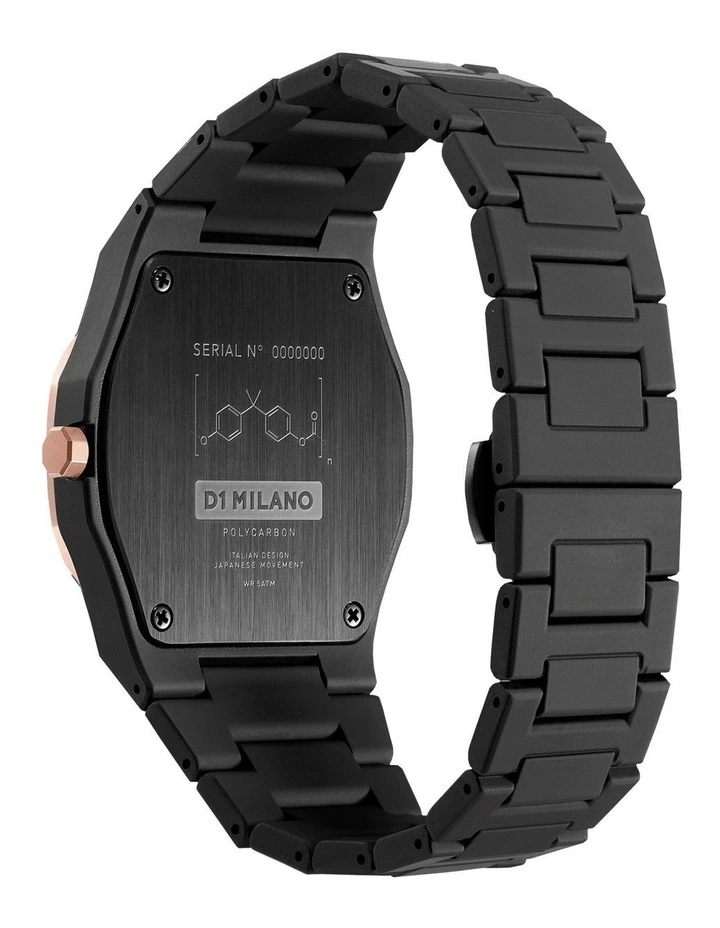 - Hands and Indices : Rose Gold Stainless Steel with Black LumiNova