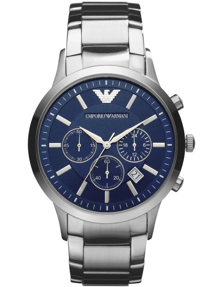Fashion meets function with this chronograph watch from Emporio Armani. The stainless steel case features a navy blue dial and a date window for added functionality. The three-link bracelet, with both polished and brushed stainless steel, adds the finishing touch.