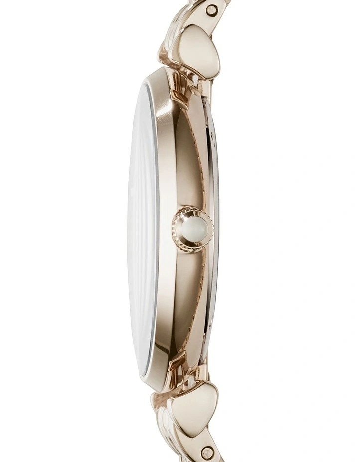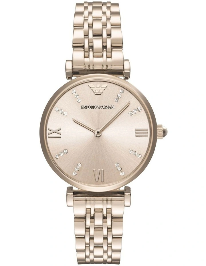 The pale pink case of this Emporio Armani ladies’ watch gleams with a gray sunray dial that is accented with pav crystal indexes, rose pale pink Roman numerals and the iconic eagle logo at the 12 o’clock hour. The look is complete with a pale pink IP seven-link bracelet.