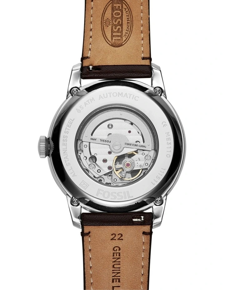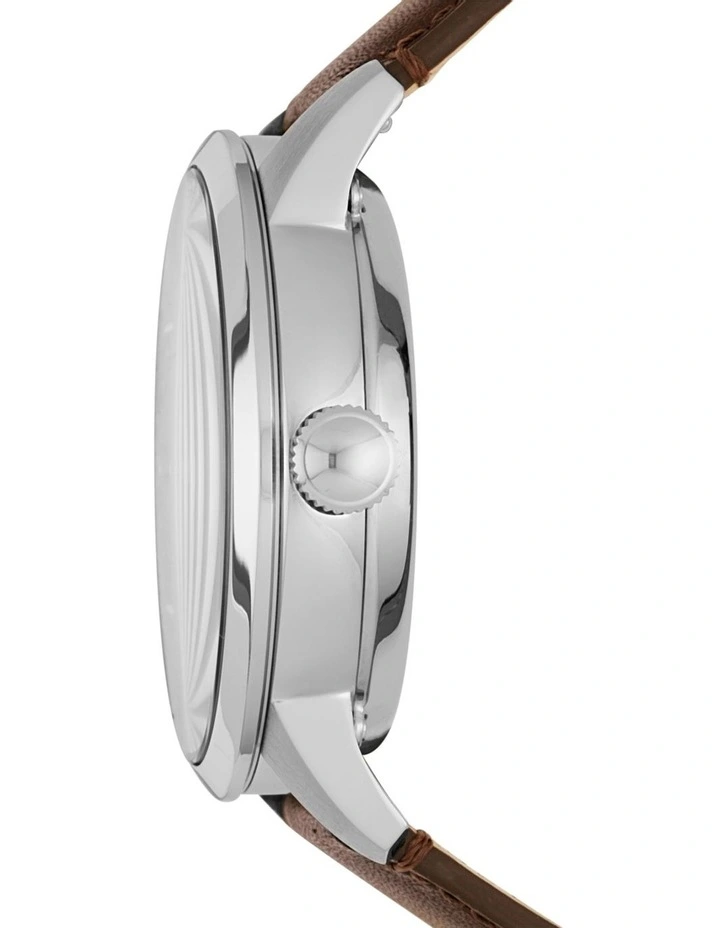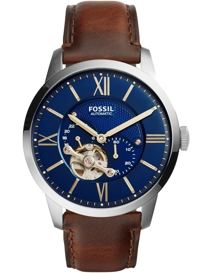 The top-of-the-hour Townsman automatic takes its cues from vintage designs. Included with our up-to-the-minute innovation? A refined steel case with a clear crystal lens, a blue satin dial and handsome brown leather straps.
