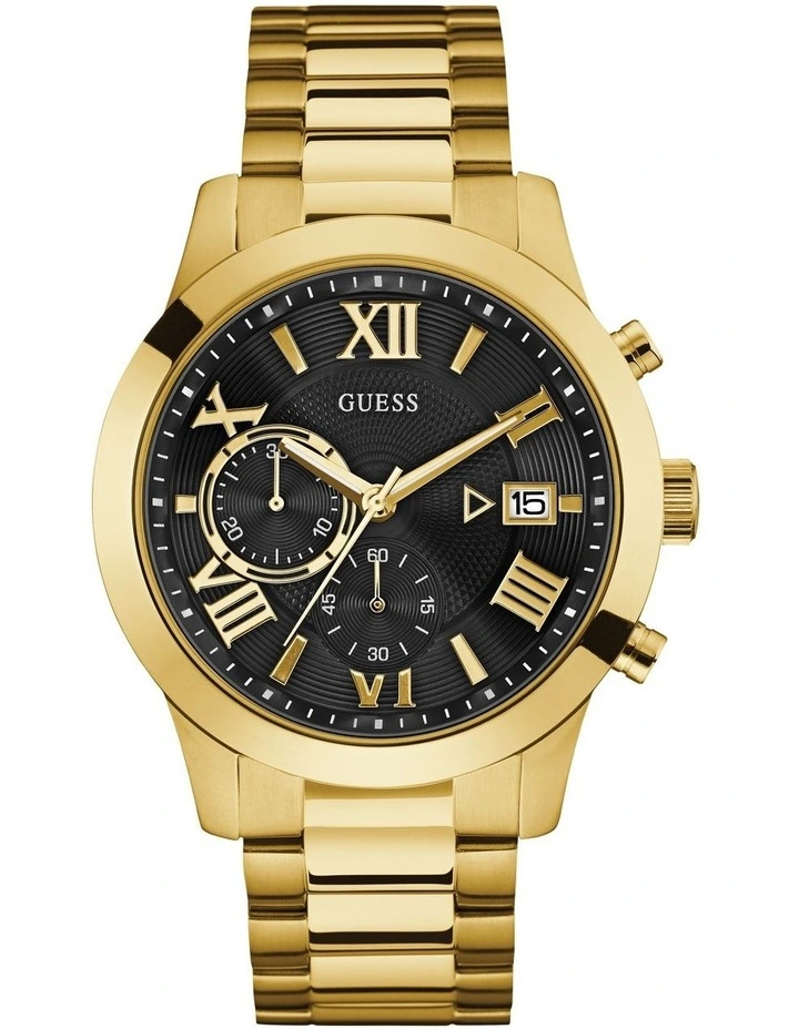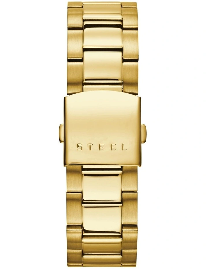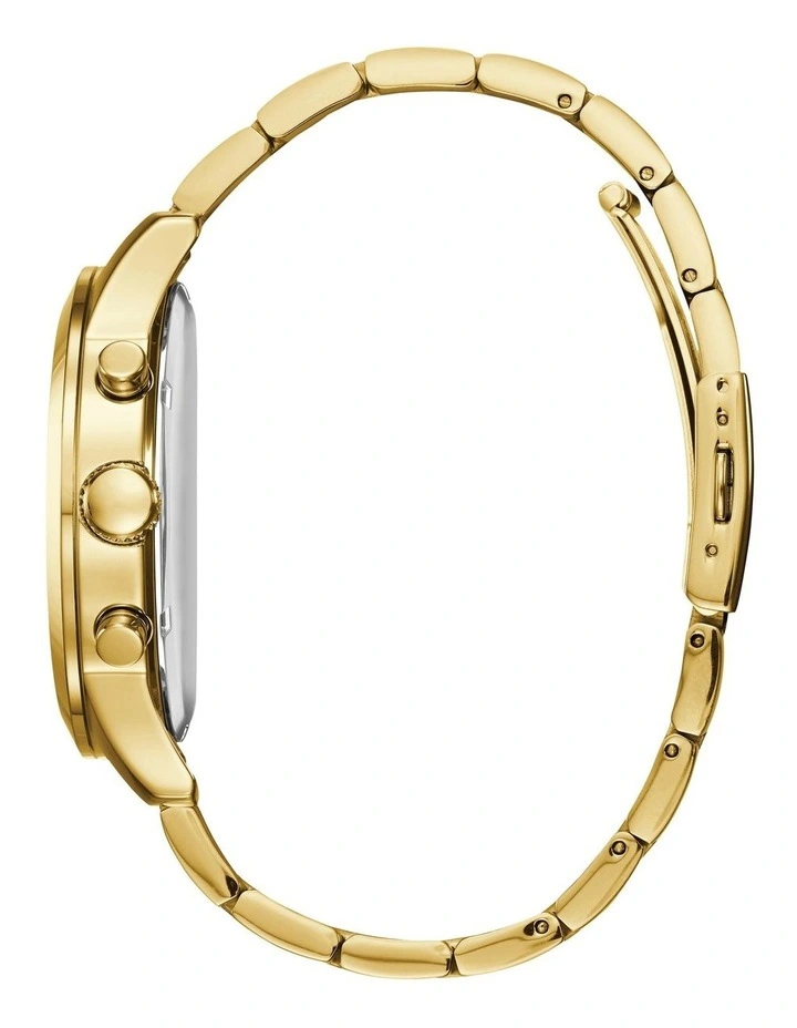 Edgy yet clean this gold look is daringly bold. Featuring a black sunray dial, chronograph movement, stainless steel gold tone case and gold tone bracelet strap.