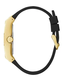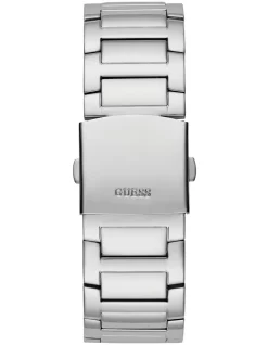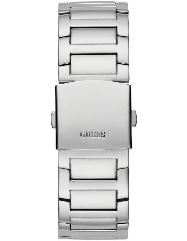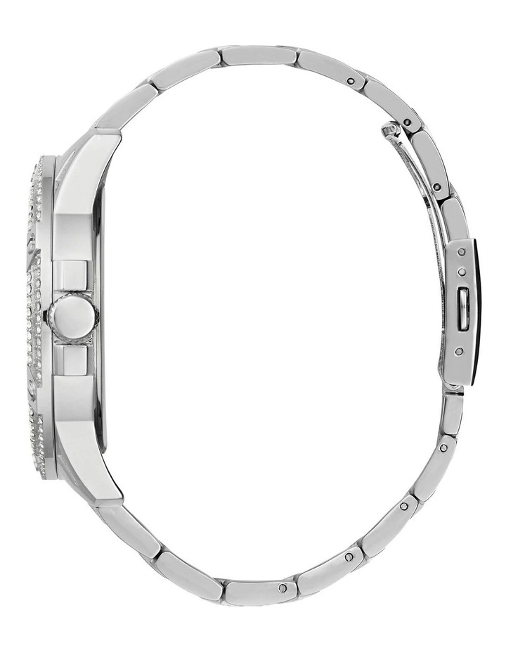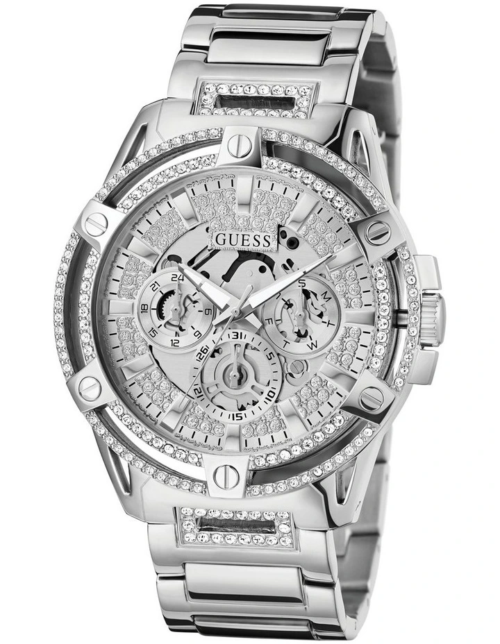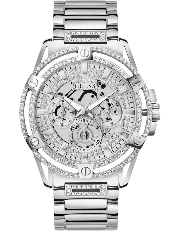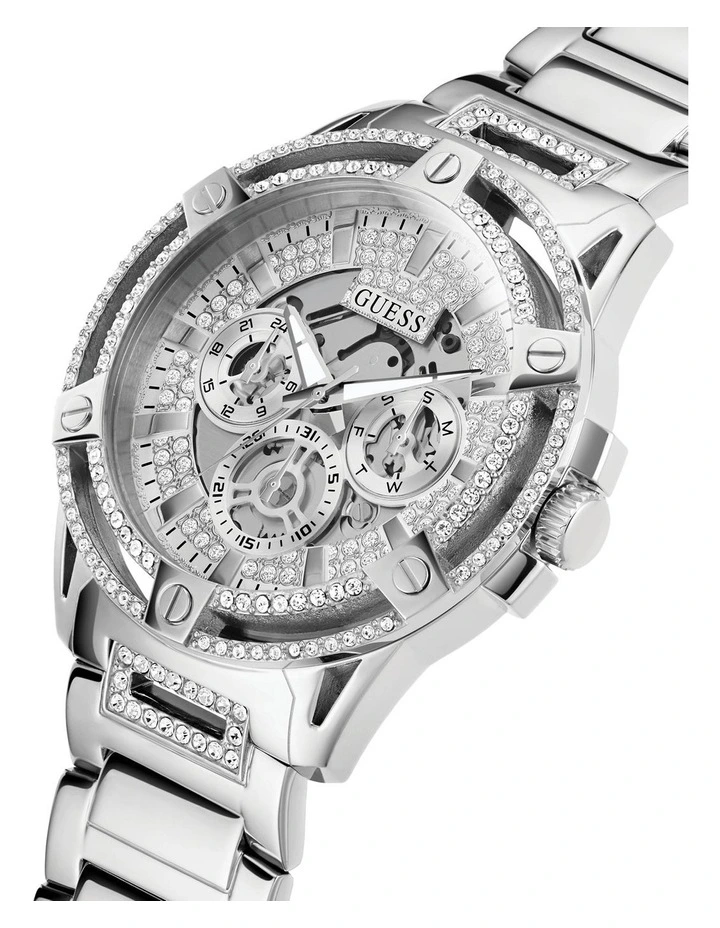 Become fashion royalty in the new big bling style from GUESS. Innovative cut-out details can be found in the bold 48mm stainless steel case and dial, with crystals embellishing the bezel & first link of the matching stainless steel bracelet.