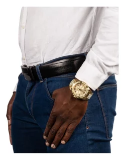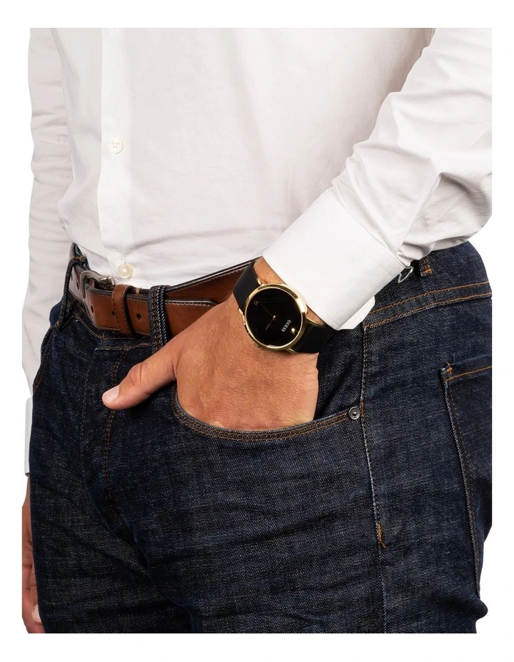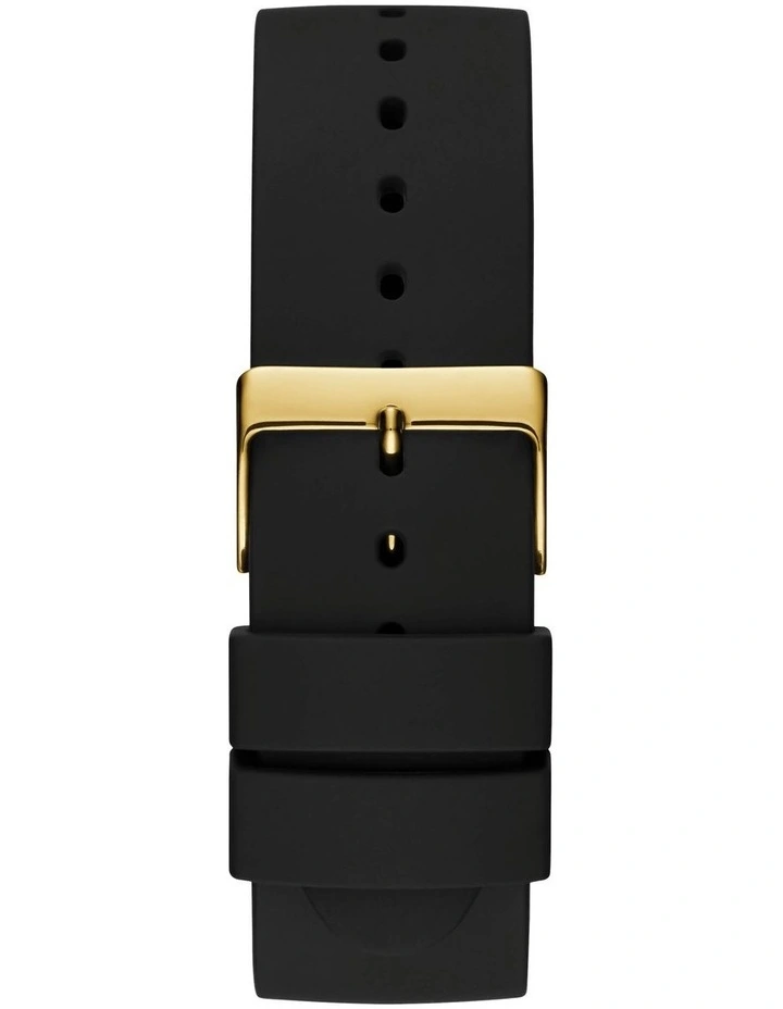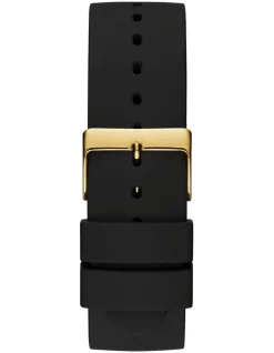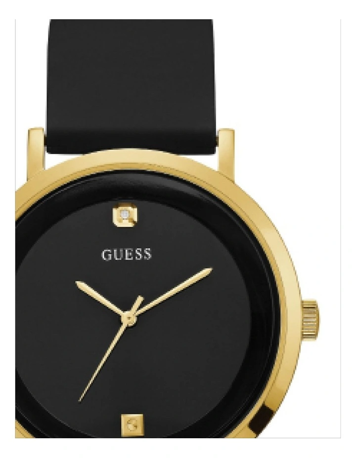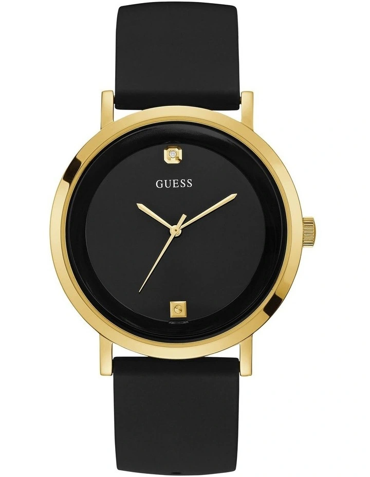 This classically understated Guess watch features a gold tone case, black silicone strap and simple black dial with genuine diamond.