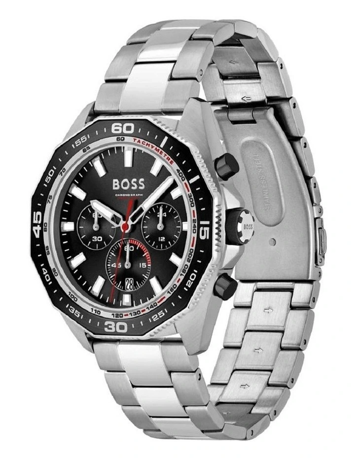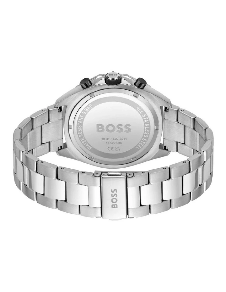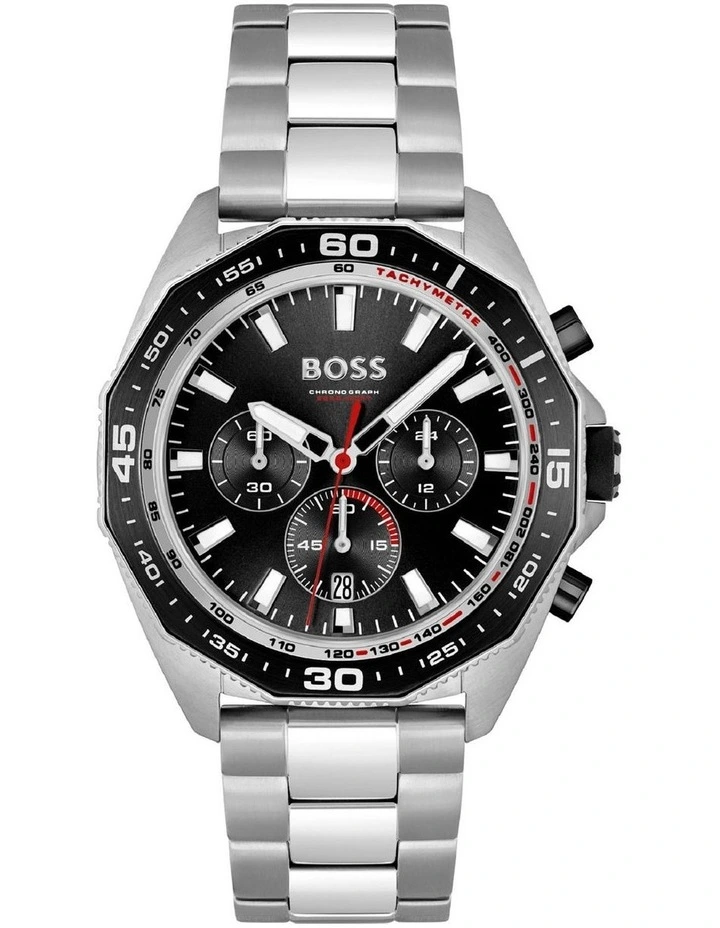 The determination of every BOSS is revealed in the design of the BOSS Energy, a contemporary chronograph with a striking geometric and textured bezel. Pushers, crown protection, and a tachymeter ensure a sporty aesthetic, while three sub eyes add dimension to the sunray dial, detailed with super-luminescent indexes. A stitched silicon strap or link bracelet completes the timepiece, offered in both classic shades and bold modern colors.