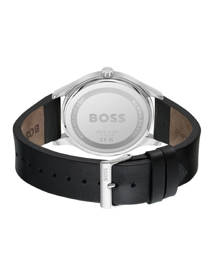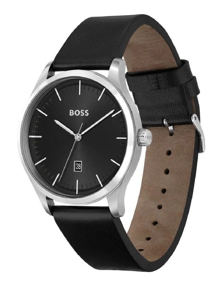 A BOSS knows he can be anyone he wants to be. Enter the BOSS Reason, a clean and minimal three-hand timepiece with date function that epitomizes his confidence and focus. The pared-back design includes a sunray dial with applied polished indexes, detailed with the BOSS logo at 12 oclock. In stainless steel or black IP, the case is combined with a smooth black leather strap or polished link bracelet in a classic or two-tone finish.