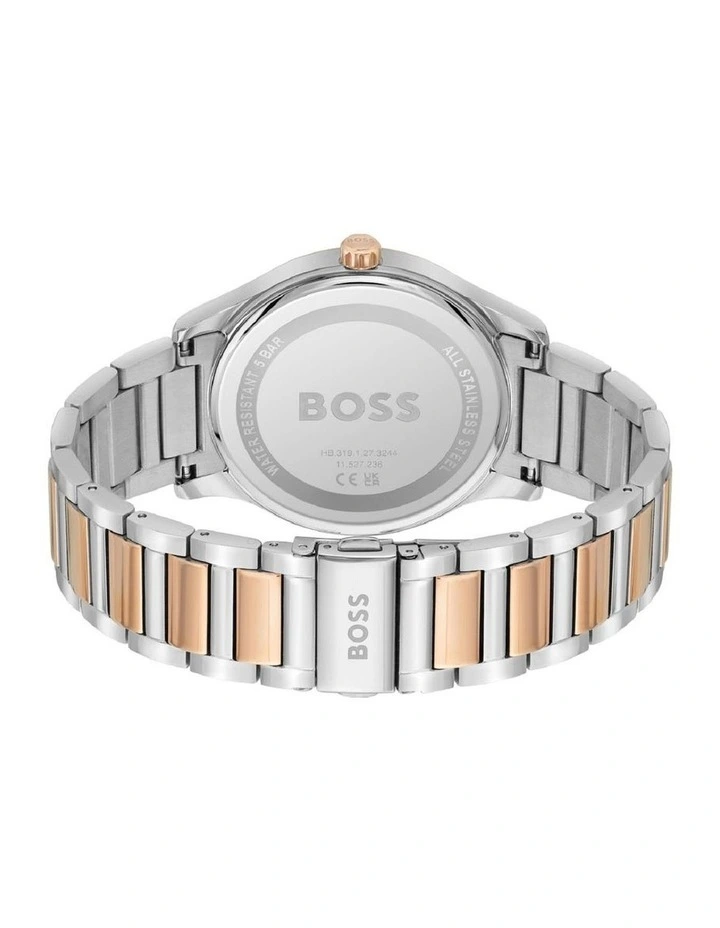 A BOSS knows he can be anyone he wants to be. Enter the BOSS Reason, a clean and minimal three-hand timepiece with date function that epitomizes his confidence and focus. The pared-back design includes a sunray dial with applied polished indexes, detailed with the BOSS logo at 12 oclock. In stainless steel or black IP, the case is combined with a smooth black leather strap or polished link bracelet in a classic or two-tone finish.