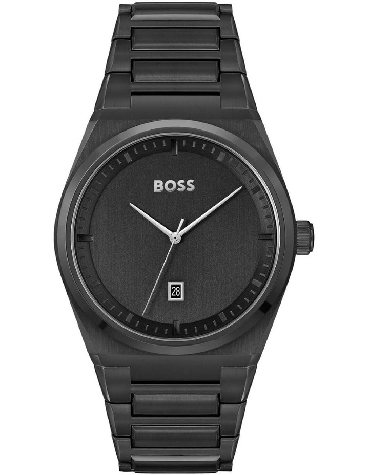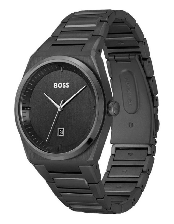 The BOSS man leads a self-determined life, always moving forward with clarity and confidence. The Bauhaus-inspired BOSS Steer reflects his focused attitude in its pared-back design, with seamless case-bracelet integration through chamfered lugs and links. This three-hand watch with date function features a vertically brushed dial, framed by a stamped-down minute track and minimalist indexes, while slim, polished hands add signature BOSS elegance.