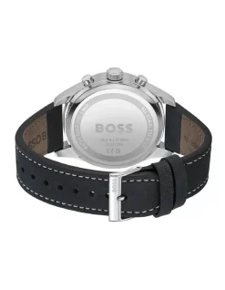 The BOSS man takes flight with the pilot-look View, a bold chronograph with date function dedicated to those who dare to fly higher. CD-cut sub eyes inspired by cockpit instruments draw the eye to the finely sandblasted dial, while large numbers and luminescent details add a contemporary twist to the vintage-feel design. Securing with a distressed leather strap or link bracelet, this timepiece is offered in a range of color combinations to complement every look.