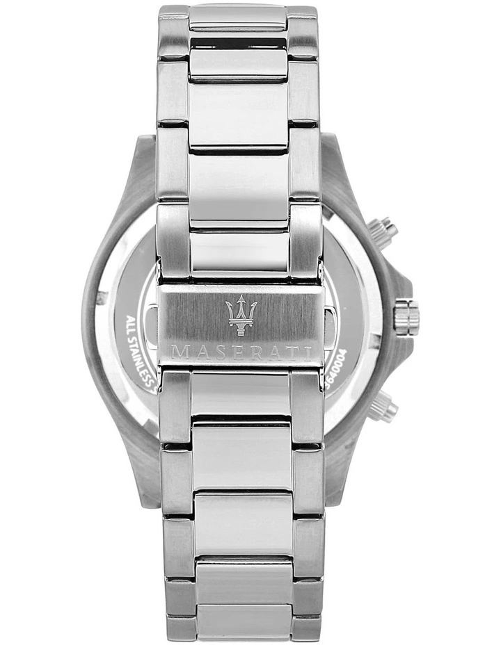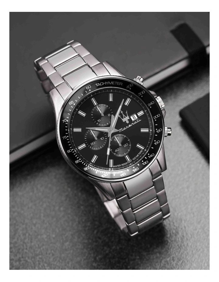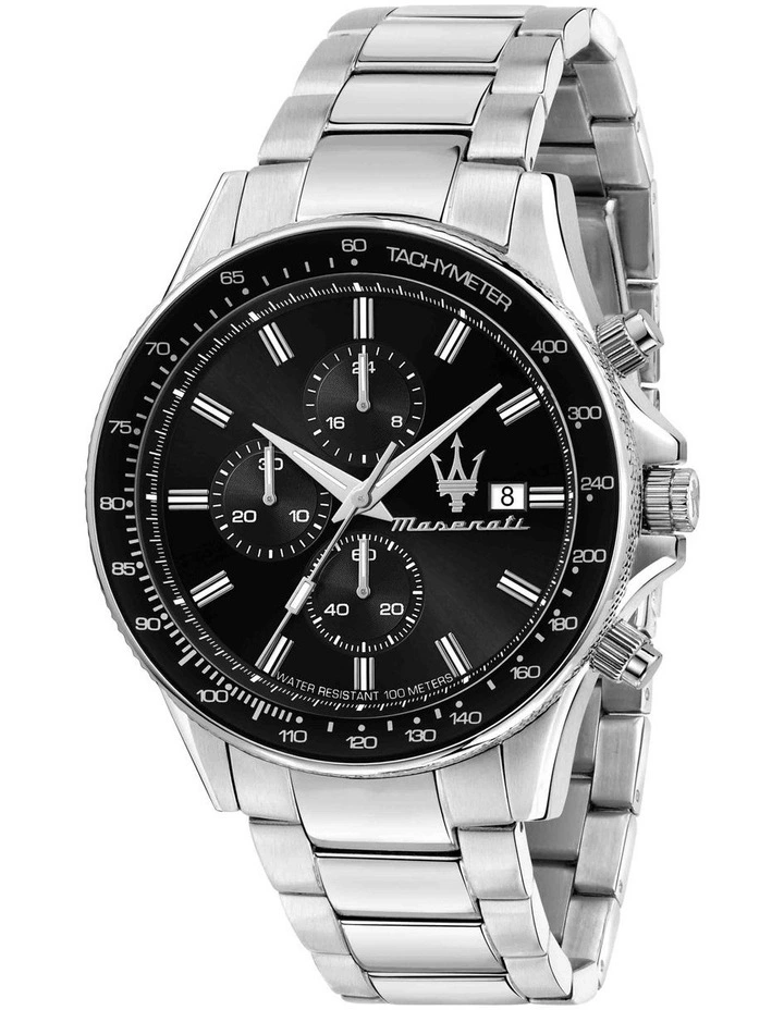 Presenting the Maserati Sfida 44mm Black Watch. The Maserati Sfida Collection consists ofwatches with sporty elegance, characterized by a structured design,steel case (44mm) with rotating or tachymeter bezel, knurling finish onone side. The sunray effect or modern dgrad dials offer elegance and rigour, distinctive features of Maserati maison. The new models from Sfida collection are based on Maserati’s values and sporting heritage. Detailed watch constructions and colour nuances enhance the super luxury brand DNA.
