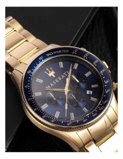 Presenting the Maserati Sfida 44mm Gold Chronograph Watch. The Maserati Sfida Collection consists ofwatches with sporty elegance, characterized by a structured design,steel case (44mm) with rotating or tachymeter bezel, knurling finish onone side. The sunray effect or modern dgrad dials offer elegance and rigour, distinctive features of Maserati maison. The new models from Sfida collection are based on Maserati’s values and sporting heritage. Detailed watch constructions and colour nuances enhance the super luxury brand DNA.