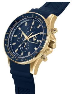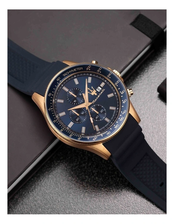 Presenting the Maserati Sfida 44mm BlueΒ Gold Watch. The Maserati Sfida Collection consists ofwatches with sporty elegance, characterized by a structured design,steel case (44mm) with rotating or tachymeter bezel, knurling finish onone side. The sunray effect or modern dgrad dials offer elegance and rigour, distinctive features of Maserati maison. The new models from Sfida collection are based on Maserati’s values and sporting heritage. Detailed watch constructions and colour nuances enhance the super luxury brand DNA.
