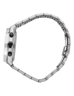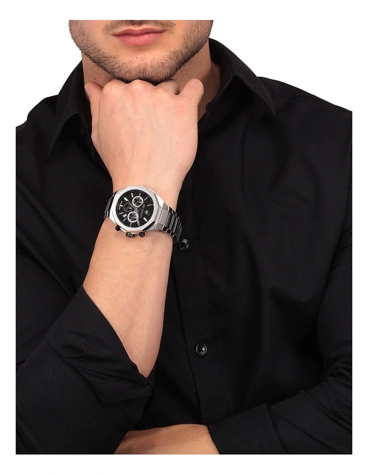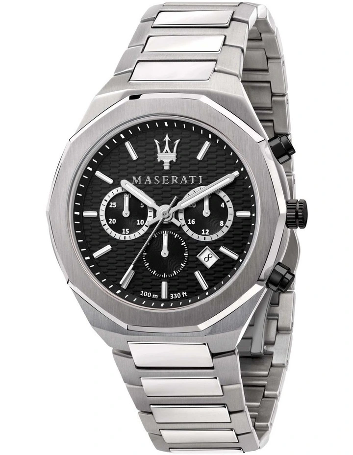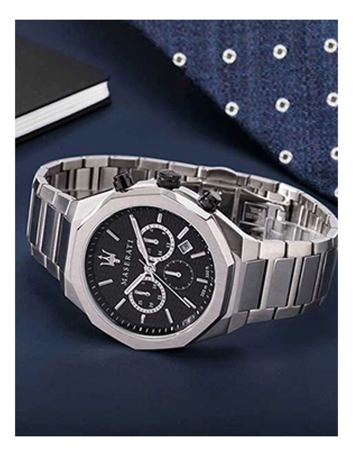 Presenting the Maserati Stile Silver Chronograph Watch. Welcome to the Maserati Stile Collection: watches that take up the mechanics, construction and stylistic codes of the iconic sporting watchmaking timepieces. The decisive lines, the distinctive decagonal bezel and theslim case are combined with details that strongly identify the sportingworld such as: pump pushers, screw-down crown, multi-level dial, appliedluminescent indexes, luminescent hands and a buckle with a personalisedbutterfly clasp featuring the applied Trident.