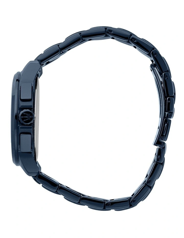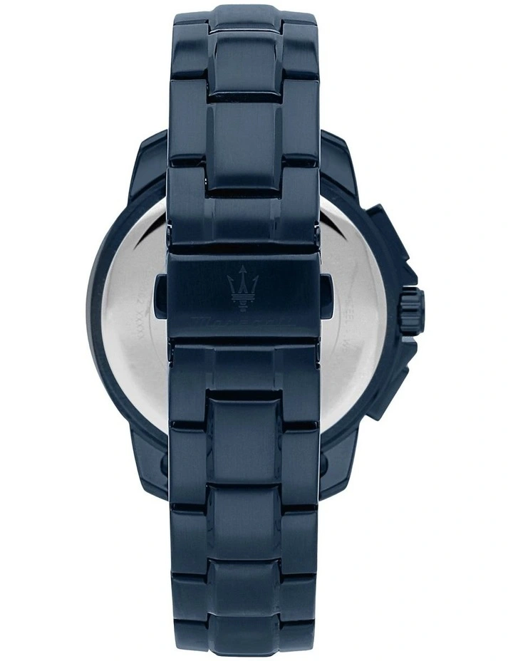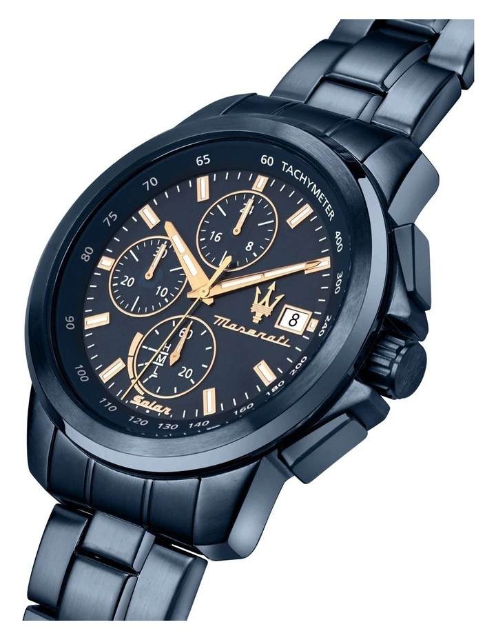 Cutting-edge technical solutions are behind the watches from Maserati Successo Solar collection, creating technical masterpieces such as this Maserati Successo Solar Blue Chronograph Watch. Watches powered by solar cells that capture natural andartificial light and transform it into energy for the movement (chronoand 3H). Their autonomy, when fully wound, is approximately four months. A sporty look with a 44mm case for the men’s version, whichfeatures dials with luminescent indexes and hands, contrasting finishesand a power reserve indicator.