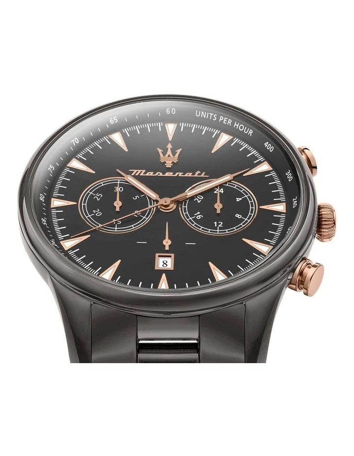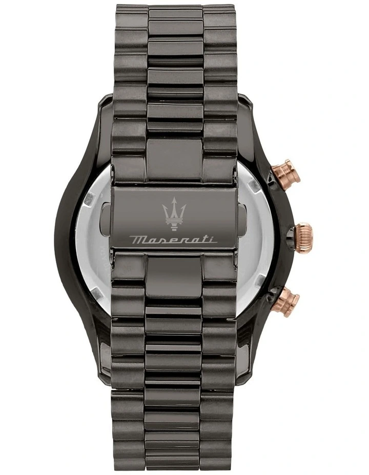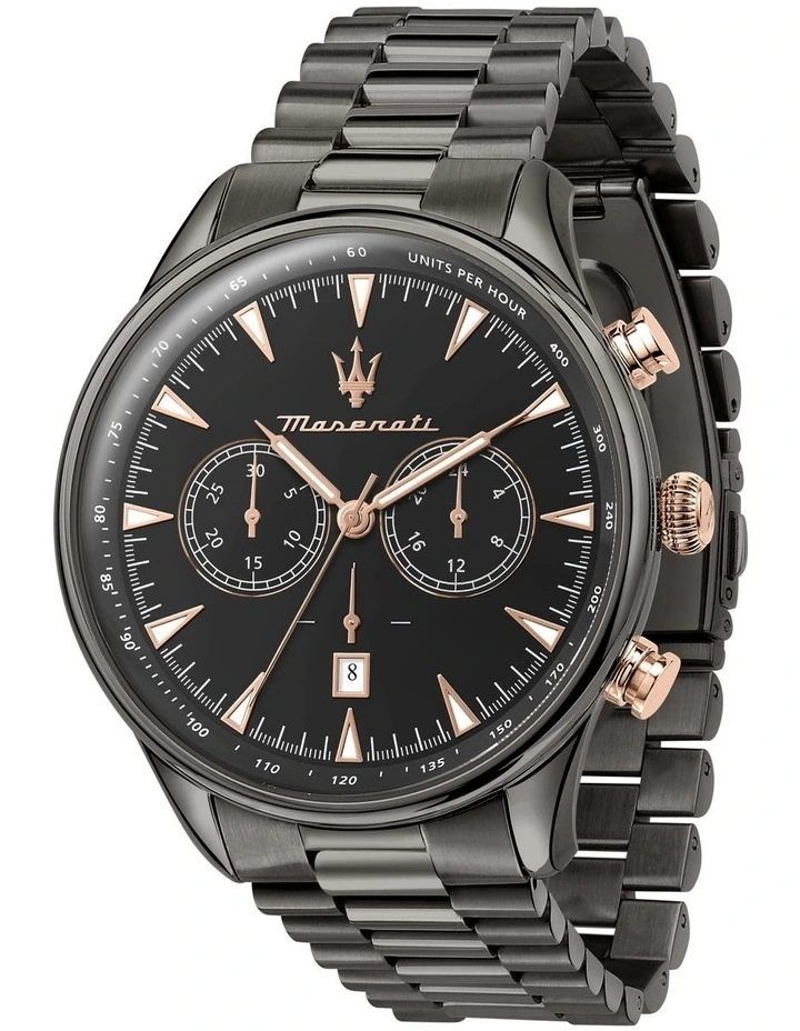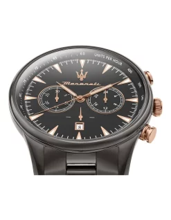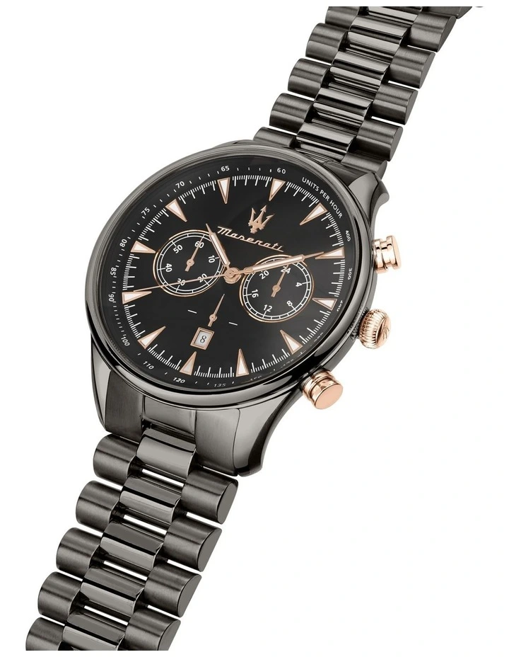 Presenting the Maserati Tradizione 45mm Gunmetal Chronograph Watch. Celebrate the style and the performance of Maserati brand, with TRADIZIONE Collection. Pared-down silhouettes, soft volumes and slim cases give rise to models with classic lines and style details that recall a vintage mood.