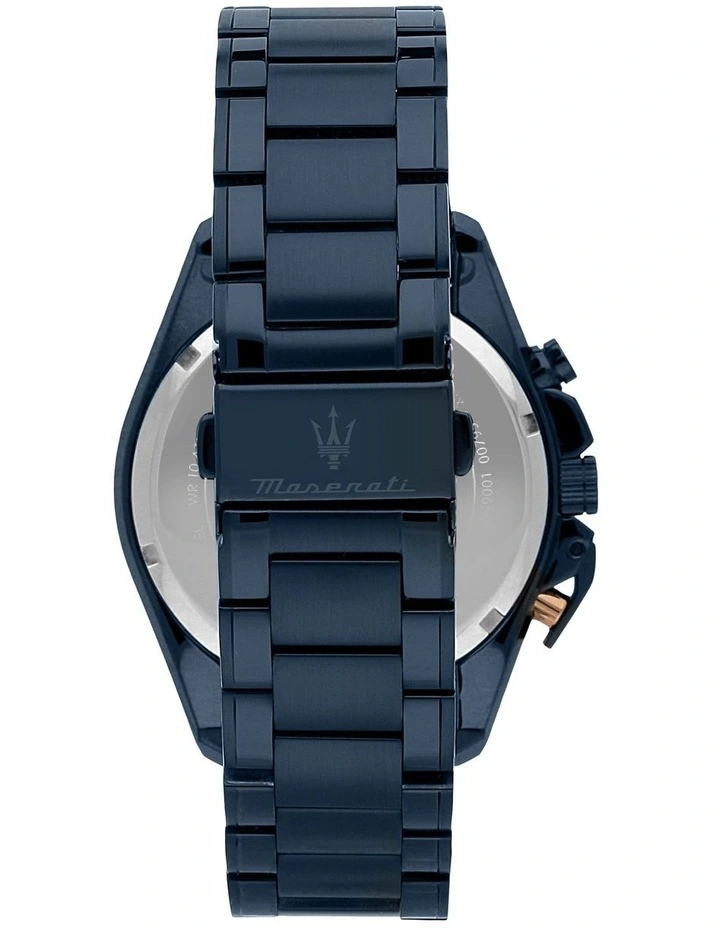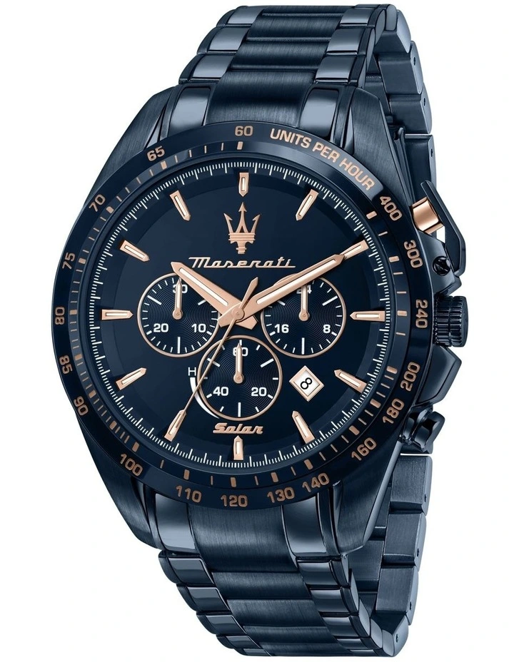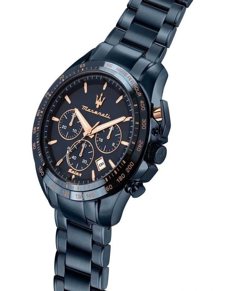 Cutting-edge technical solutions are behind the watches from Maserati Traguardo Solar collection, creating technical masterpieces such as this Maserati Traguardo Solar Blue Chronograph Watch. Watches powered by solar cells that capture natural andartificial light and transform it into energy for the movement (chronoand 3H). Their autonomy, when fully wound, is approximately four months. A sporty look for the men’s version, whichfeatures dials with luminescent indexes and hands, contrasting finishesand a power reserve indicator.