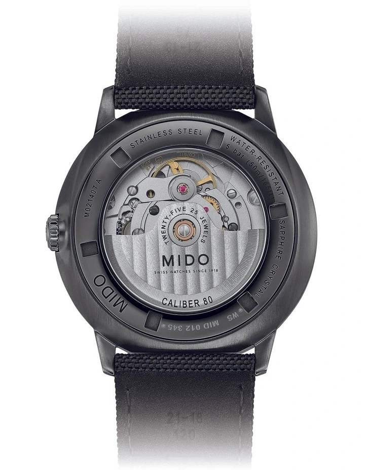 - Movement: Automatic Mido Caliber 80 (base ETA C07.611)