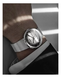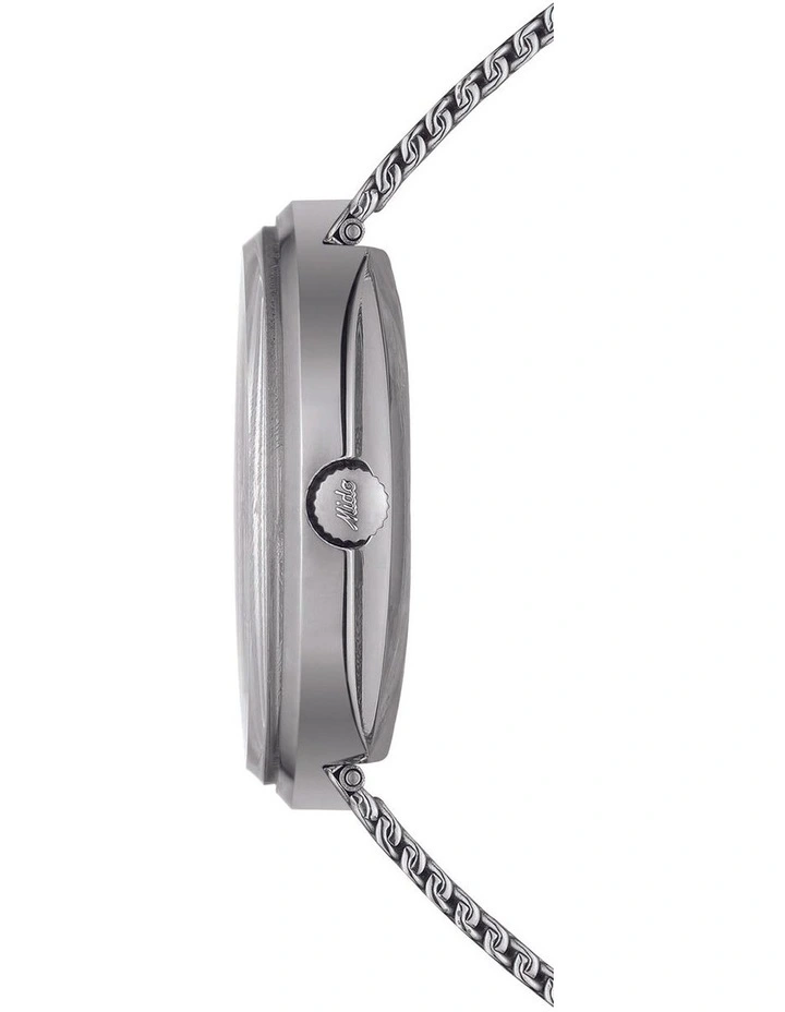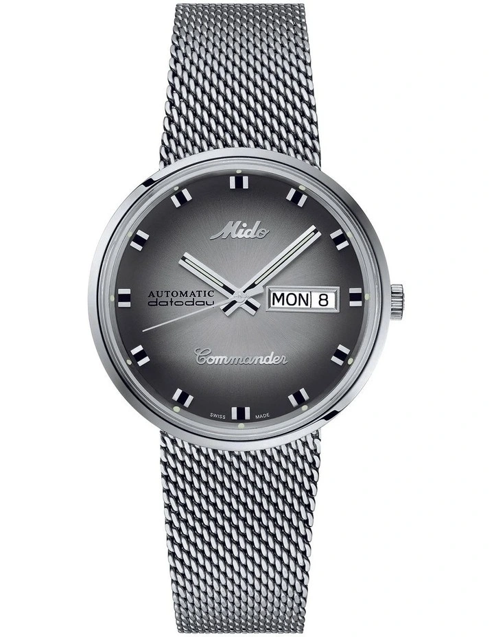 The Commander Shade watch is an animated variation of an original Commander model from the ’70s. Its monocoque case, automatic watch movement, integrated Milanese mesh bracelet and acrylic glass marked with the Mido logo give this piece a retro look. The gradient two-tone satin-finished dial, specific to the Shade family, gives it its name and solar identity.