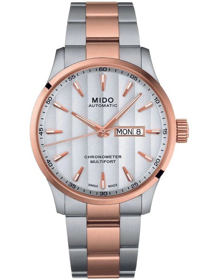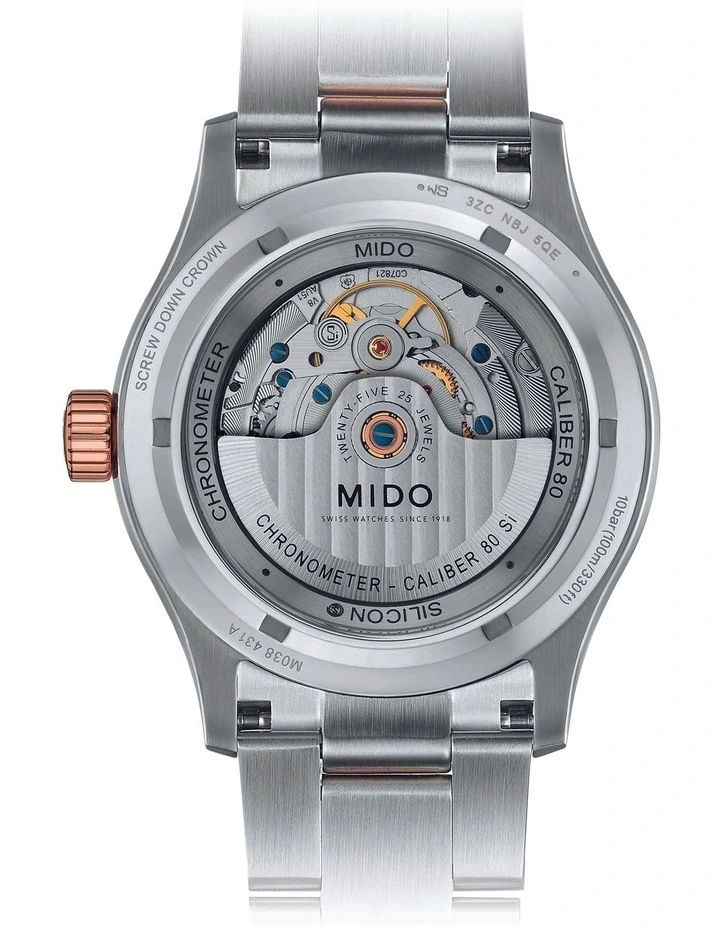 - The Multifort Chronometer watch is equipped with a Caliber 80 exclusive automatic movement that is enhanced with silicon technology. Remarkably accurate and resistant, it features the Geneva Stripes that are specific to the collection. The watch is completed by a graduated bezel and a more refined look thanks to its satin-finished indexes and hands. Its special case back has an integrated and engraved flange. Movement: Automatic Mido Caliber 80 COSC Si (base ETA C07.821) Power Reserve: Up to 80 hours