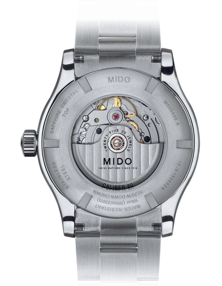 - Movement: Automatic Mido Caliber 80 (base ETA C07.621)
