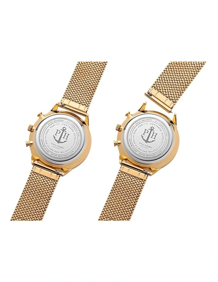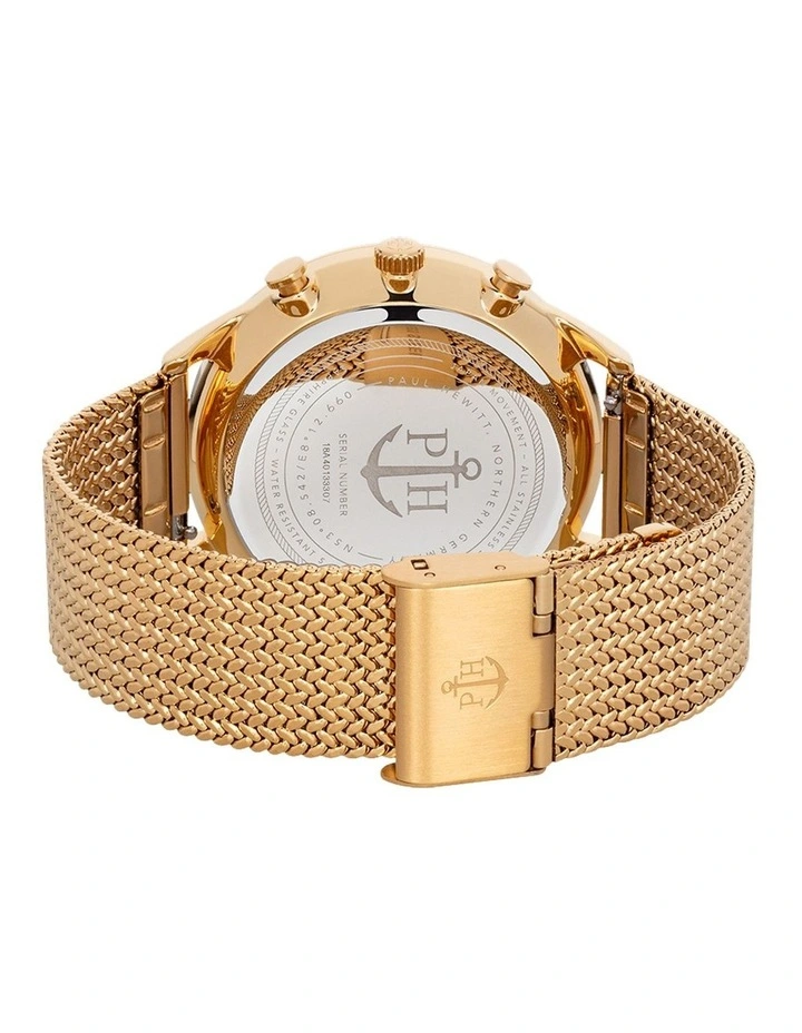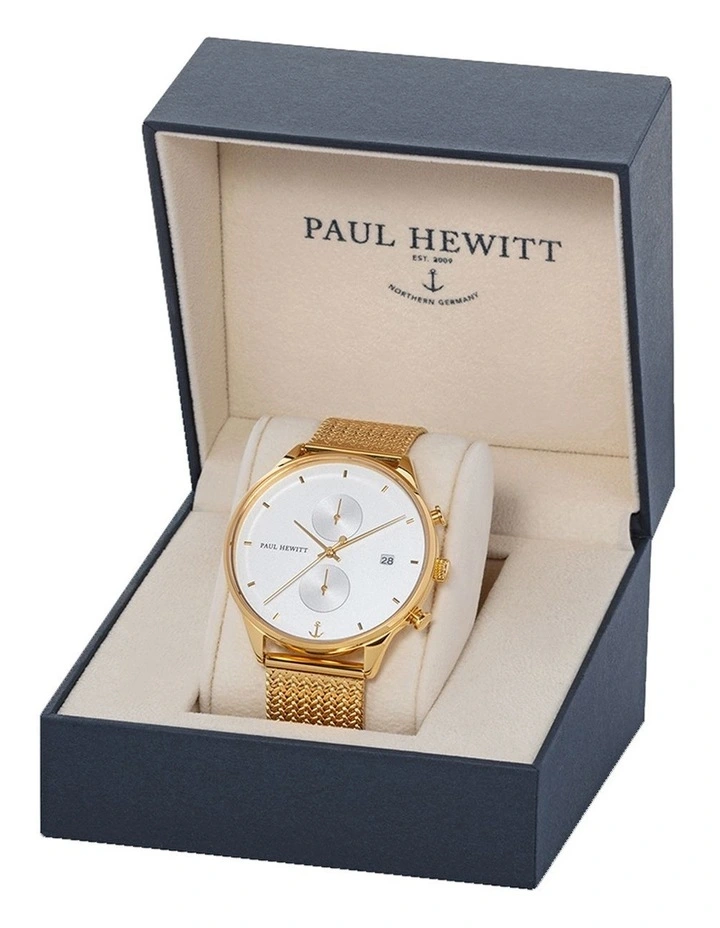 Stripped to thebarest essentials, this mens watch from the PAUL HEWITT Chrono focuses on thefundamental details. The slim design of the white face meets a dominant, gold Milanesemesh strap. Keep your style ahead of the times and express the bold side ofyour character.