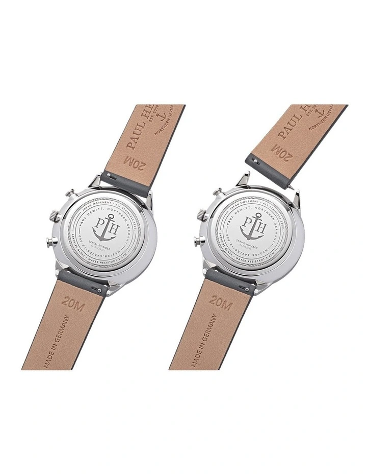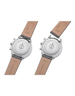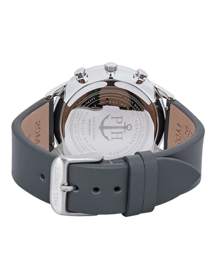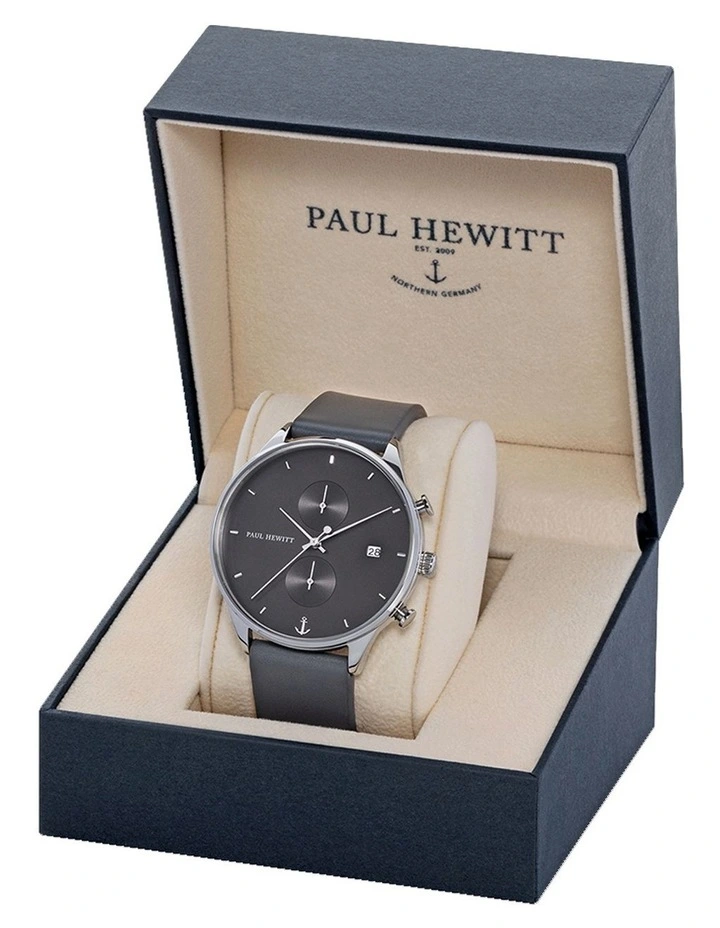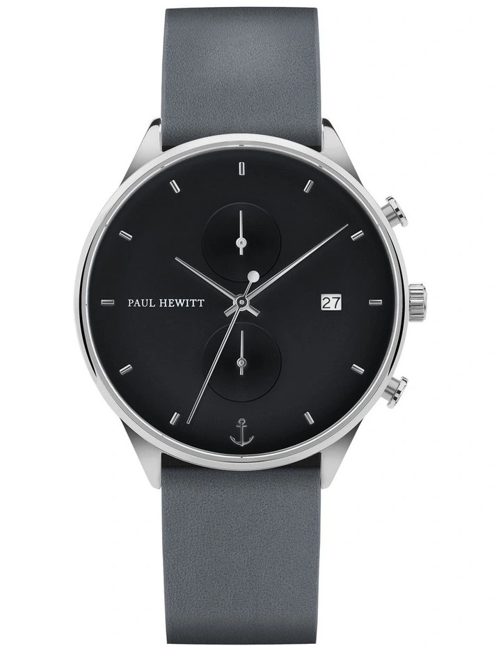 Stripped to thebarest essentials, this mens watch from the PAUL HEWITT Chrono focuses on thefundamental details. The slim design of the black face meets a dominant greyand blue-coloured canvas watch strap. Keep your style ahead of the times andexpress the bold side of your character.