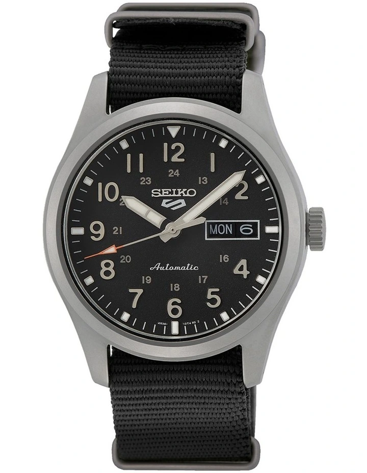 From the iconic Seiko 5 Sports collection that embodies reliability, durability, performance and value, this watch is from the field military series and features a calibre 4R36 automatic movement with approximately 41hours power reserve. The classic, vintage looking dial takes inspiration from the original Seiko 5 Sports first released in the 60’s and combines a 24 hour dial, contemporary colours with a retro feel that is perfect for modern times. This SRPG37K Sports watch features a stainless steel case and a comfortable yet versatile fabric strap which is perfect for the great outdoors.Β