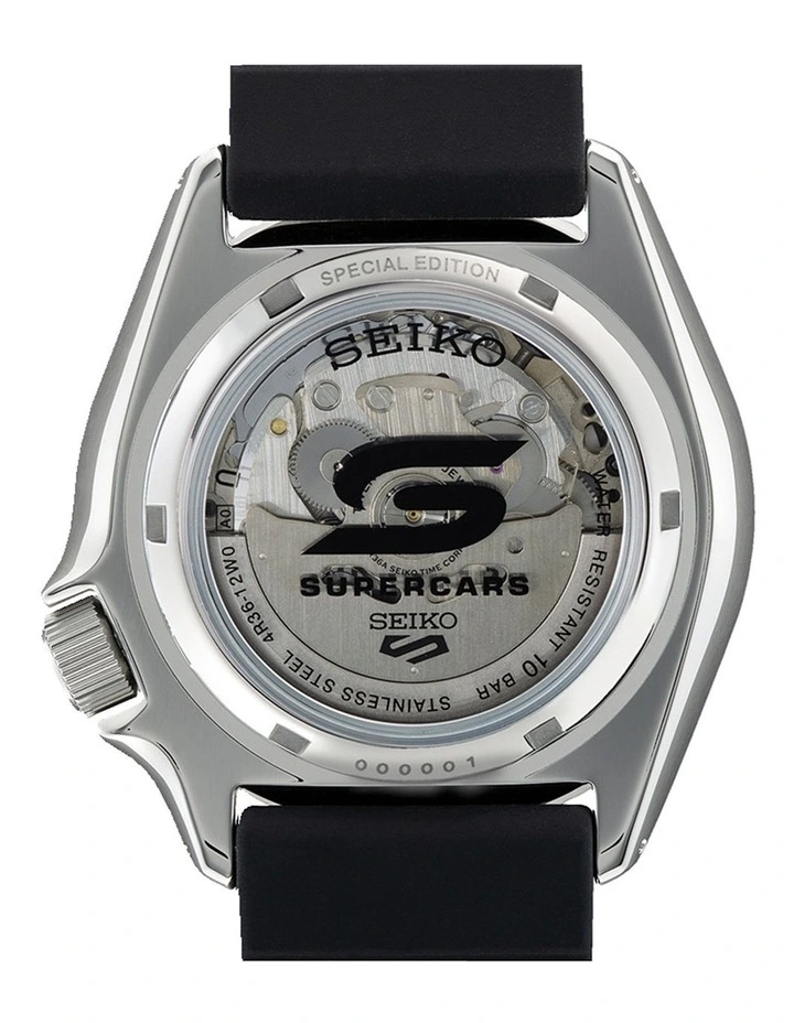 From the iconic Seiko 5 Sports collection that embodies reliability, durability, performance and value, comes the 2022 Supercars Podium Special Edition timepiece. Feature a carbon fibre pattern dial and highlighted pop of colour on the inner bezel and seconds hand, this watch is sure to impress. The iconic Supercars logo features on the exhibition case back and on the crown.