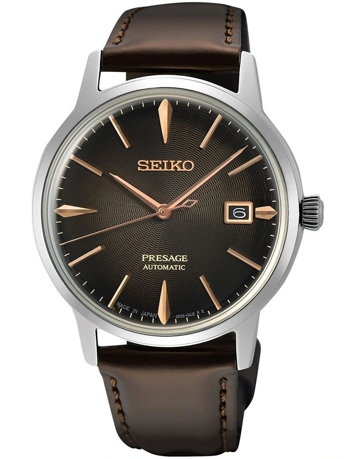 Seiko Presage brings time-honoured craftsmanship and a uniquely Japanese aesthetic to the world.Β This latest addition to the Cocktail Time series and adequately named Modern Style brings a classic brown dial with a gradient efficient set under box shaped HardlexΒ crystal glass.Β This stunning piece features a 39.5mm stainless steel case andΒ leather strap, and a calibre 4R35 movement with approximately 41 hours power reserve at full charge. It has a see through case back and is 50m water resistant. Made in Japan.