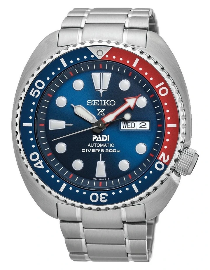Featuring the calibre 4R36, this Seiko gents Prospex Divers watch is powered by the movement of the wearer or by winding the crown and has approximately 41 hours power reserve. This model is from the PADI special edition collection and comes with its own special PADI boxing. It features durable Hardlex glass, 200m divers water resistance and a screw-down crown. The case and bracelet are stainless steel and the case shape is affectionately referred to as the Turtle by Seiko fans. With a day/date display it has a unidirectional rotating Pepsi coloured bezel and screw down crown at the 4 oclock position.