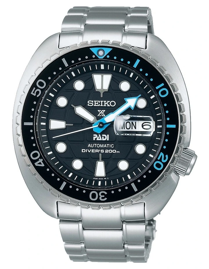 From the ever-popular Seiko Prospex collection comes this PADI special edition automatic diver’s watch. Featuring the calibre 4R36, the SRPG19K is powered by the movement of the wearer or by winding the crown and has approximately 41 hours power reserve at full charge. The dial incorporates the PADI globe logo and is enclosed in sapphire crystal glass and housed in the popular King Turtle case as dubbed by Seiko fans. This special edition timepiece comes presented in a special PADI box, has a magnified day-date window and is diver’s 200M water resistant. The stainless-steel case and bracelet have been meticulously crafted for a lustrous finish and feel.Β