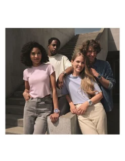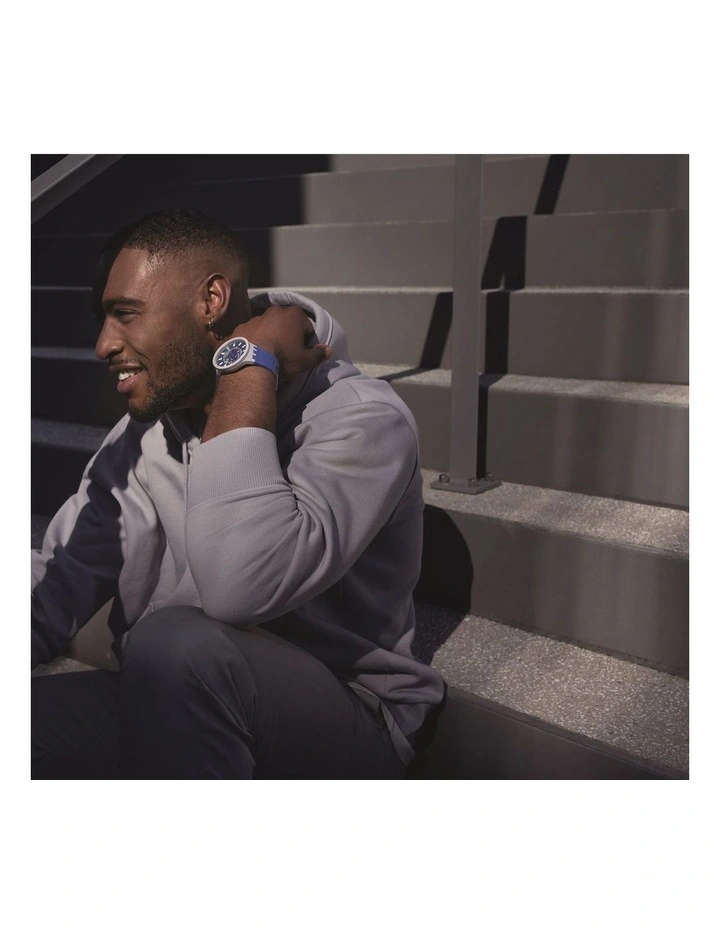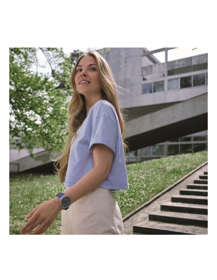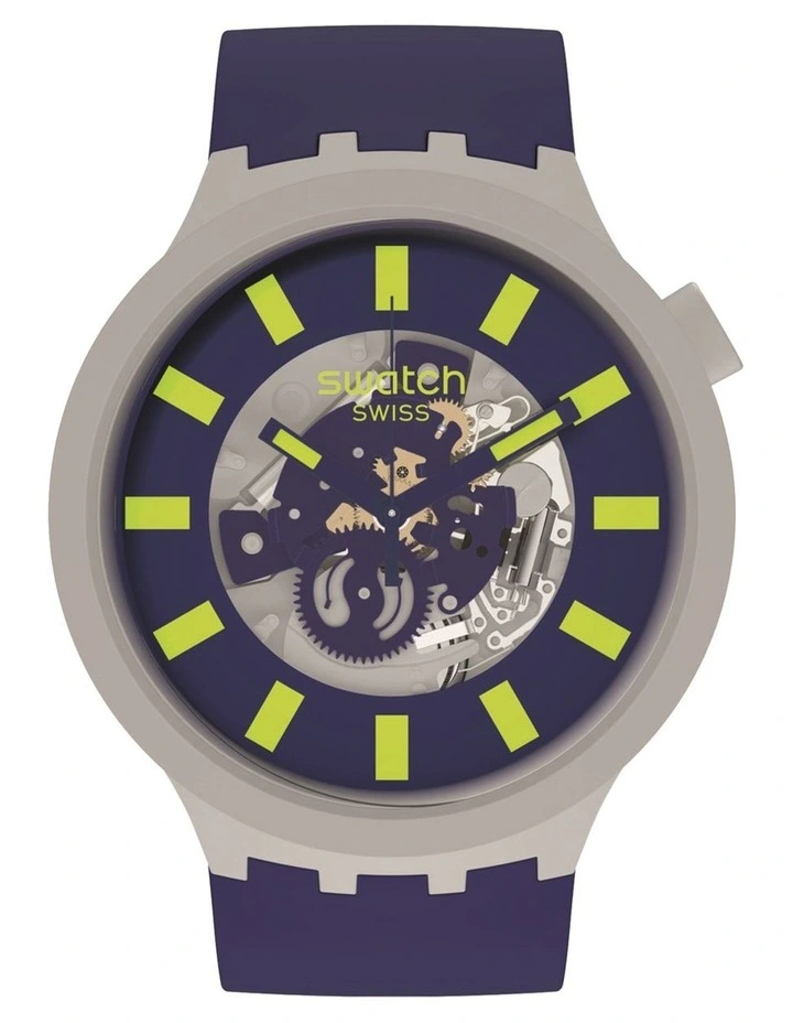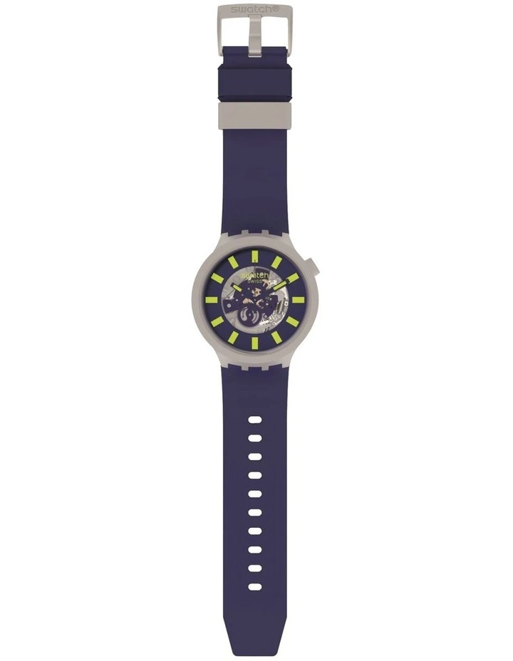 A bio-sourced matte dark blue strap and loops star on this bio-ceramic beauty. A transparent dial and yellow Swatch Glow span the best of both worlds.