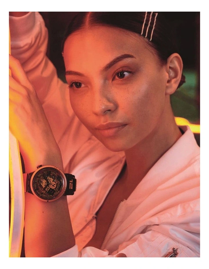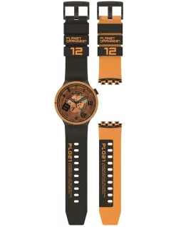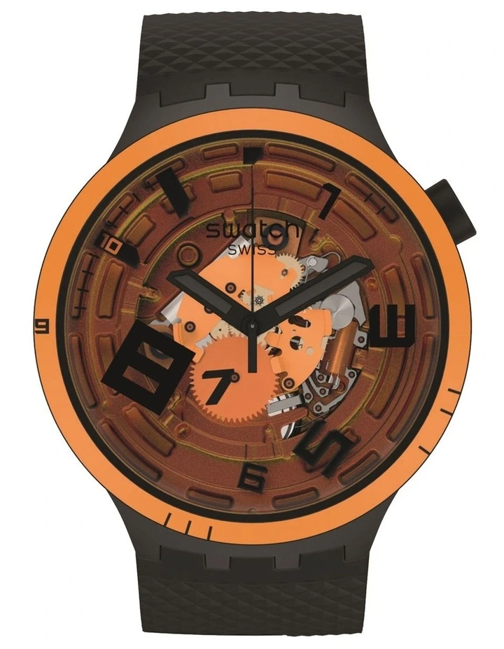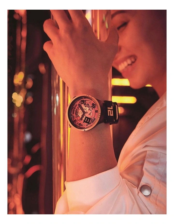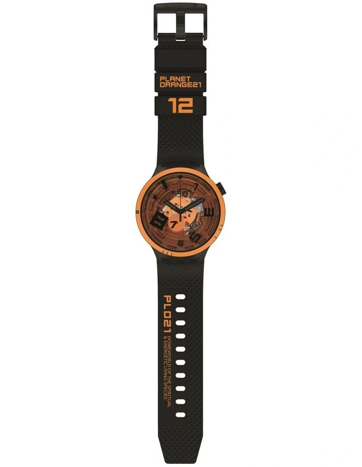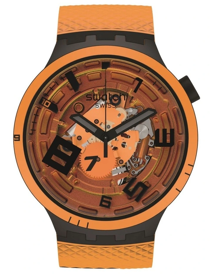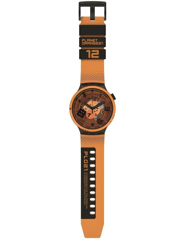 This design features a matte silicone bicompression strap in bold black and orange – and the second strap in the special packaging takes the look a step further. The transparent dial with its multicolored print gives space for the dial and hands to shine with Swatch Glow. This watch features the number seven uniquely placed onto a decorative wheel