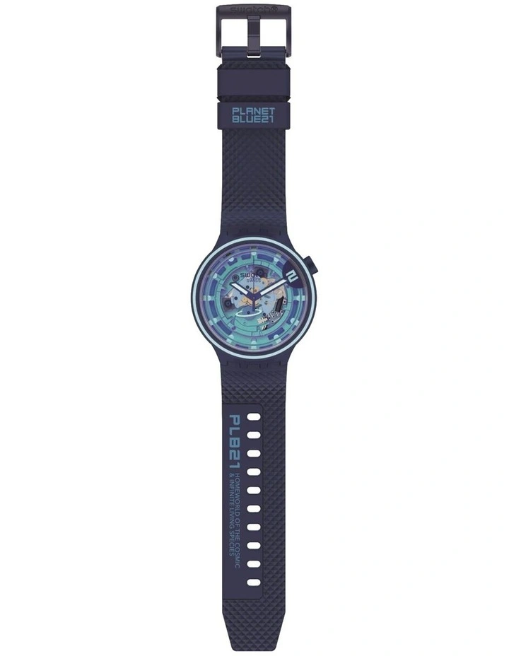 This watch is available with two space-inspired silicone straps in blocky designs – all set to showcase the stunning Swatch Solar Spectrum effect on the case. The transparent dial with its multicolored print gives space for the dial and hands to shine with Swatch Glow. The special blue planet feature in its unique placing replaces the standard driving wheel.
