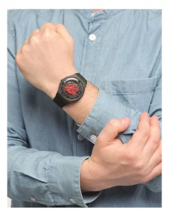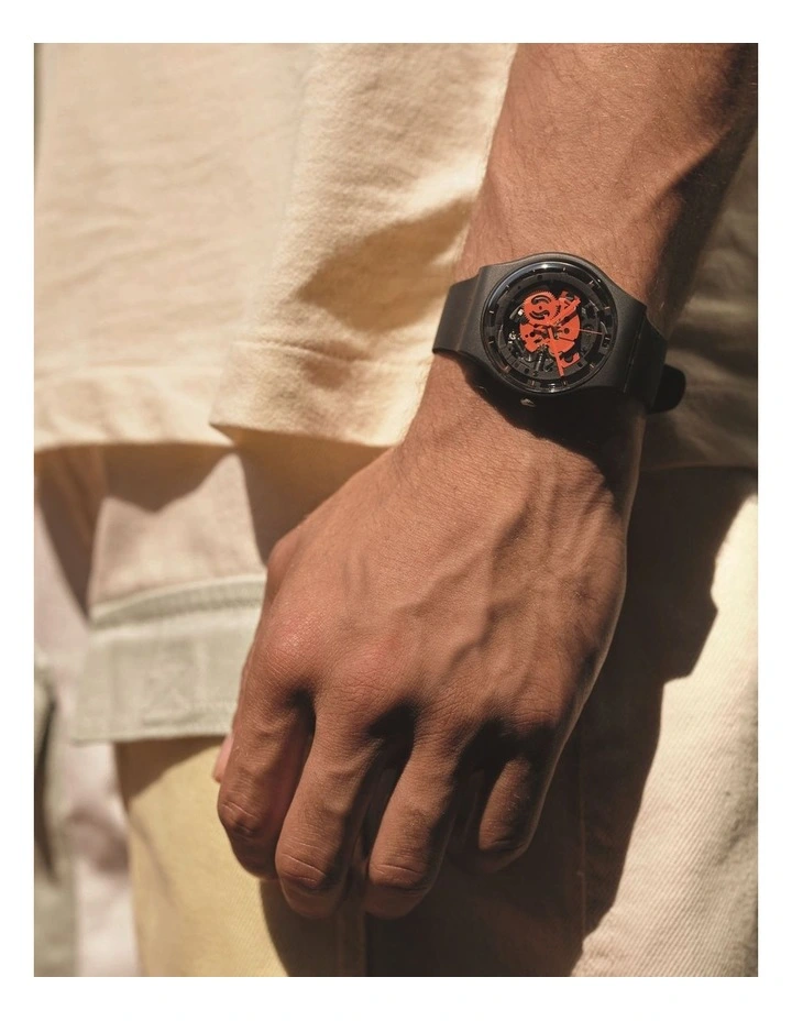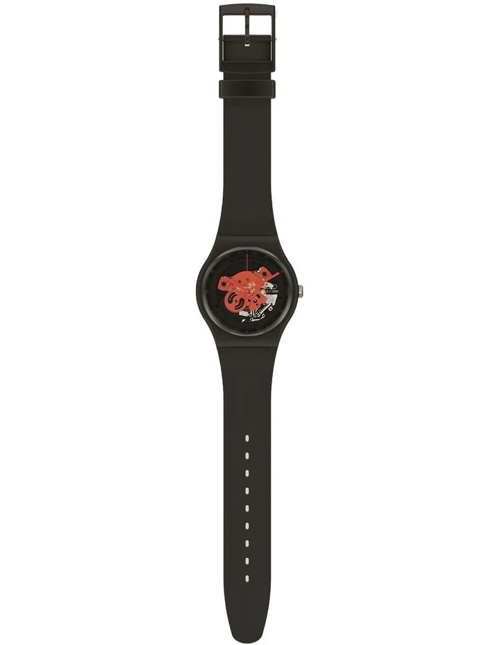 A special addition to the BIOCERAMIC styles. Crafted from bio-sourced materials, featuring a solid matte black strap and loop, with red print and red movement elements.