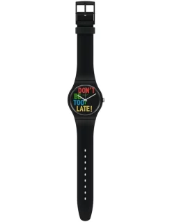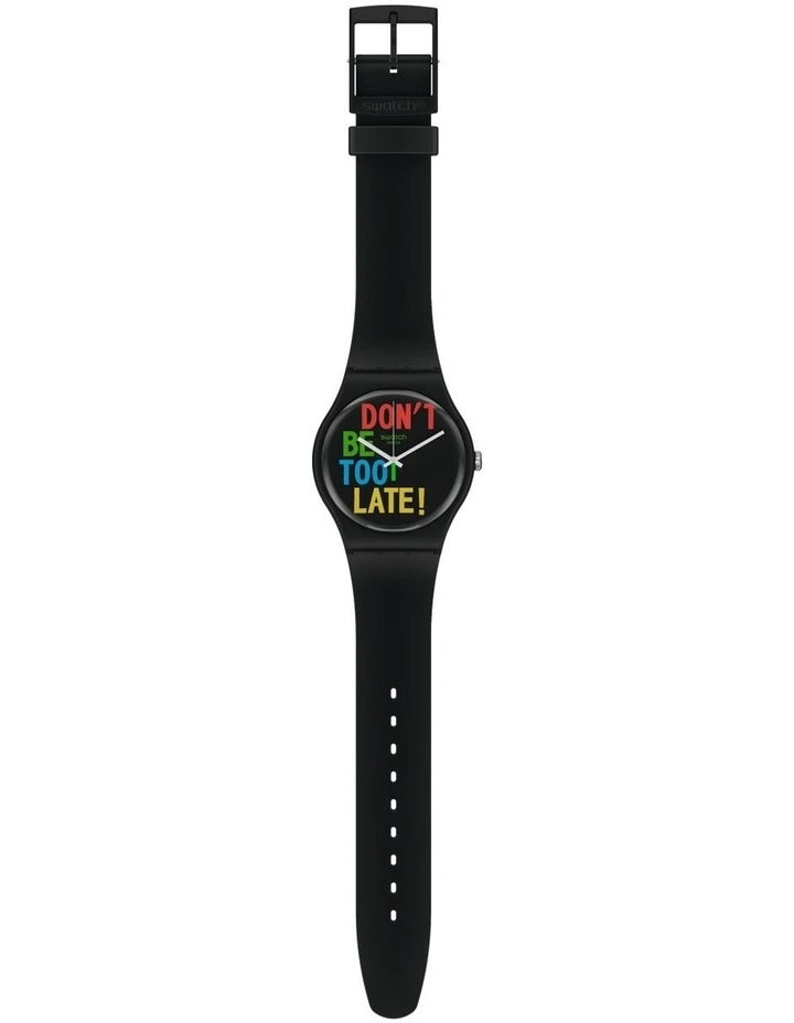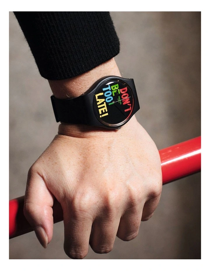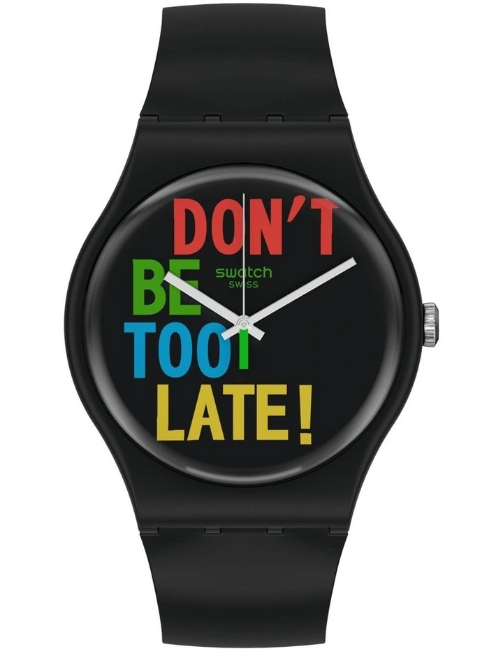 The message takes inspiration from 1984 dont be too late, the first irreverent and ironic message ever printed on a Swatch. It finds 3 different declinations: same same but different on the Gent style (spot the differenceits a color switch); call to action on the new gent style; tell me more as a decorative pattern on the movement of Sistem51 (coming in October). One cannot miss it and can join the circle with the most personal suiting style. And of course, the most suiting notion of time: every watch is named after the world TIME in one of the many world languages.