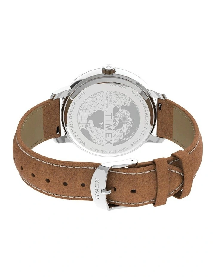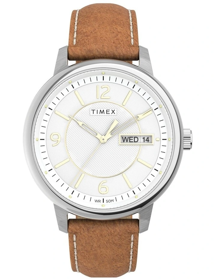 Feel like youre in Chicago when wearing this Timex piece. With its historic and modern vibe feel, featuring a Day Date display on a 45mm white dial offset with subtle gold tone accents and markers. This is then stylishly finished on a caramel leather band that will compliment any outfit or city you visit.Β