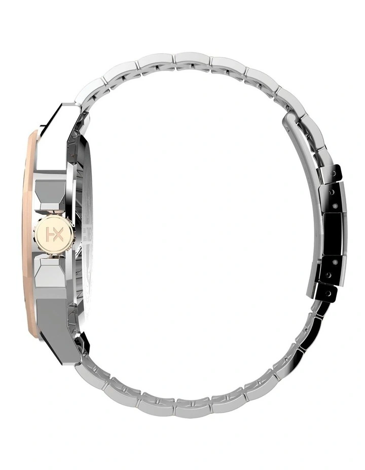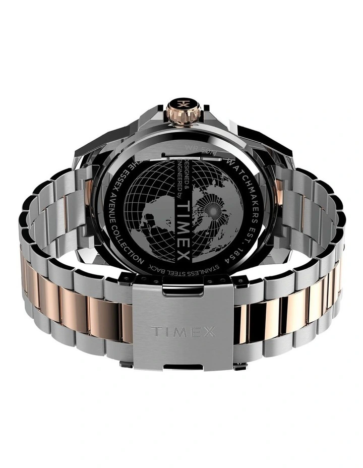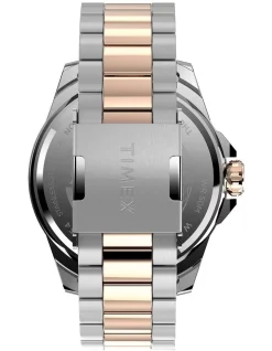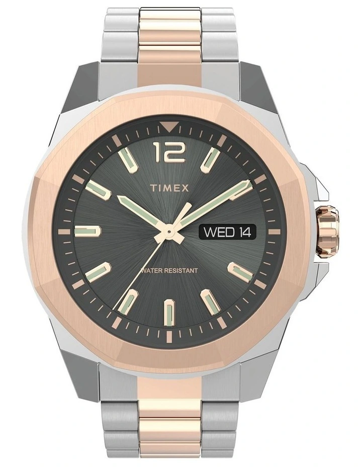Our legendary Timex durability comes to life with this modern analogue watch. The octagonal rose gold-tone bezel is the standout of this style, resting atop a 44mm stainless steel case, and is paired with a rose gold duo-tone bracelet to complete this bold yet sophisticated look.