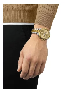 A mens Swiss-made quartz watch with scratch-resistant sapphire crystal, a champagne dial and stainless steel bi-colour bracelet.