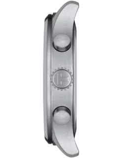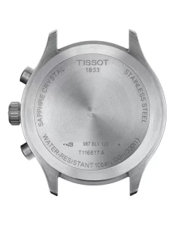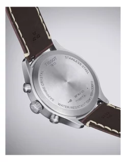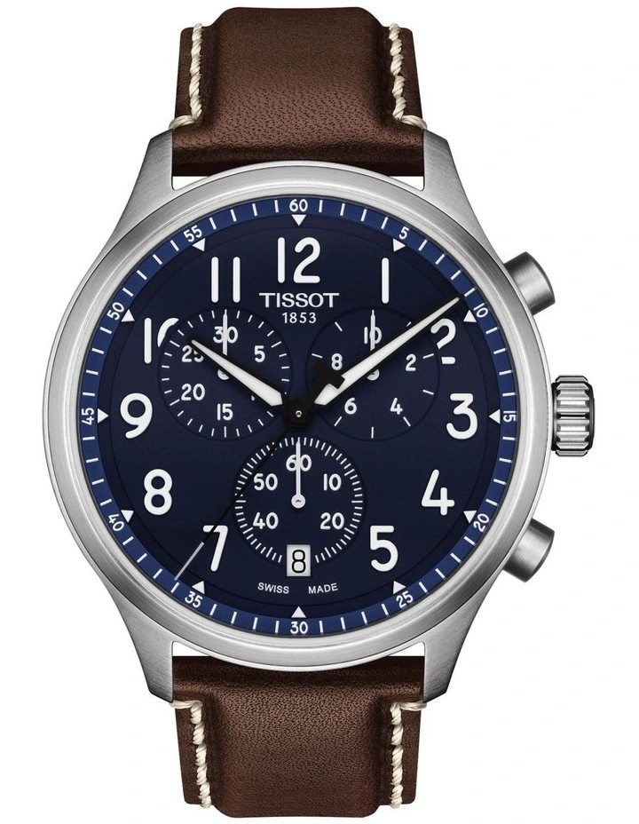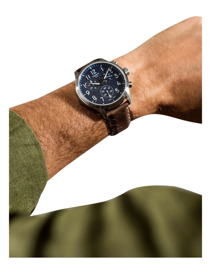 The Chrono XL Vintage takes a sporty and vintage style and matches it with Tissots Swiss technology. This Swiss-made men’s chronograph watch has a scratch-resistant sapphire crystal, a blue dial and a brown leather strap.
