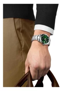 This men’s Swiss-made watch has a scratch-resistant sapphire crystal, green dial and stainless steel bracelet.