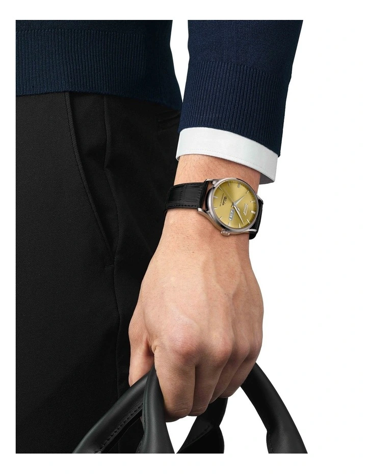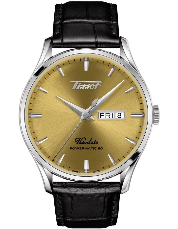 The Heritage Visodate Powermatic 80 collection celebrates Tissot’s rich history and combines nostalgia with contemporary details. This men’s Swiss-made watch features a gently curved champagne dial and domed scratch-resistant sapphire crystal to clearly show the day and date, and complemented by a leather strap. With a power reserve up to 80 hours and Nivachron balance spring with non-magnetic capabilities.