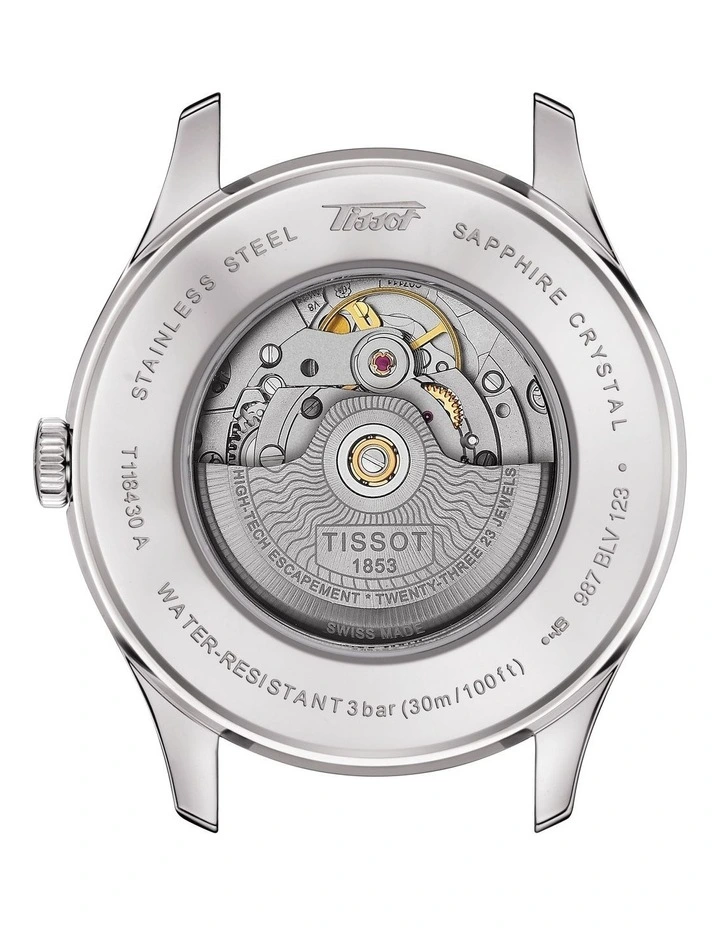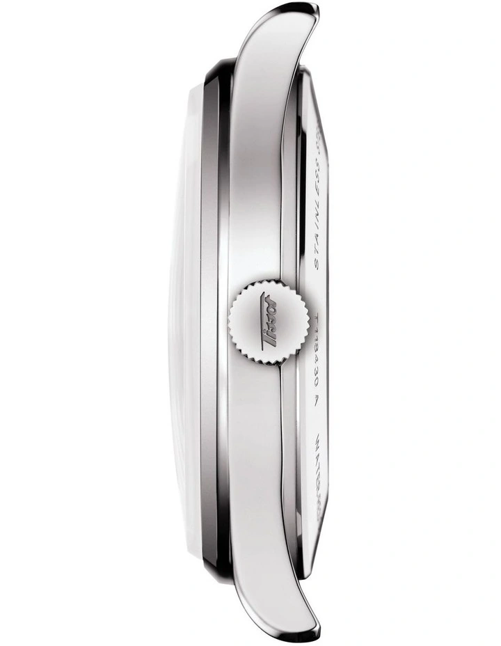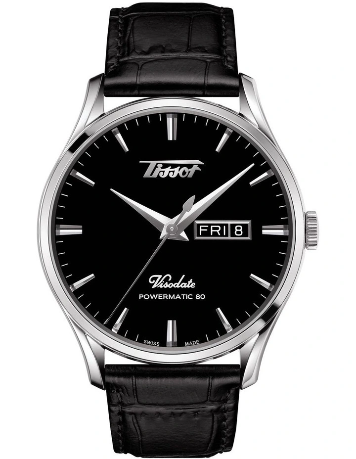 The Heritage Visodate Powermatic 80 collection celebrates Tissot’s rich history and combines nostalgia with contemporary details. This men’s Swiss-made watch features a gently curved black dial and domed scratch-resistant sapphire crystal to clearly show the day and date, and complemented by a leather strap. With a power reserve up to 80 hours and Nivachron balance spring with non-magnetic capabilities.