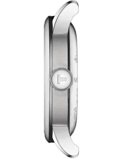 A mens Swiss-made automatic watch with scratch-resistant sapphire crystal, silver dial and stainless steel bracelet.