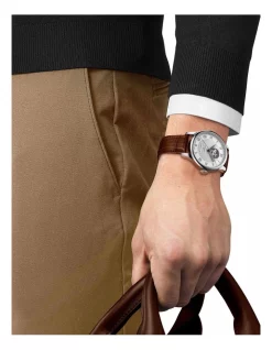 A mens Swiss-made automatic watch with scratch-resistant sapphire crystal, a silver dial and a brown synthetic leather strap.