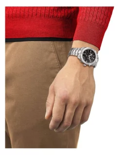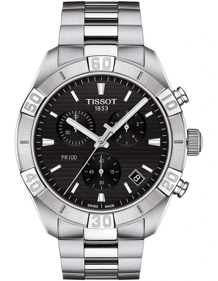 Both sporty and elegant, the Tissot PR 100 Sport Gent Chronograph takes on a robust design with a bold bezel. The high-quality components of this men’s Swiss-made watch guarantees the best suitability for everyday use. With chronograph functions, scratch-resistant sapphire crystal, a black dial and a luminous coating on the hands and indices.