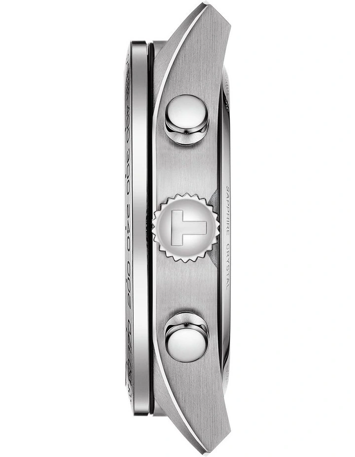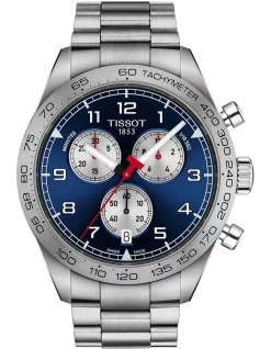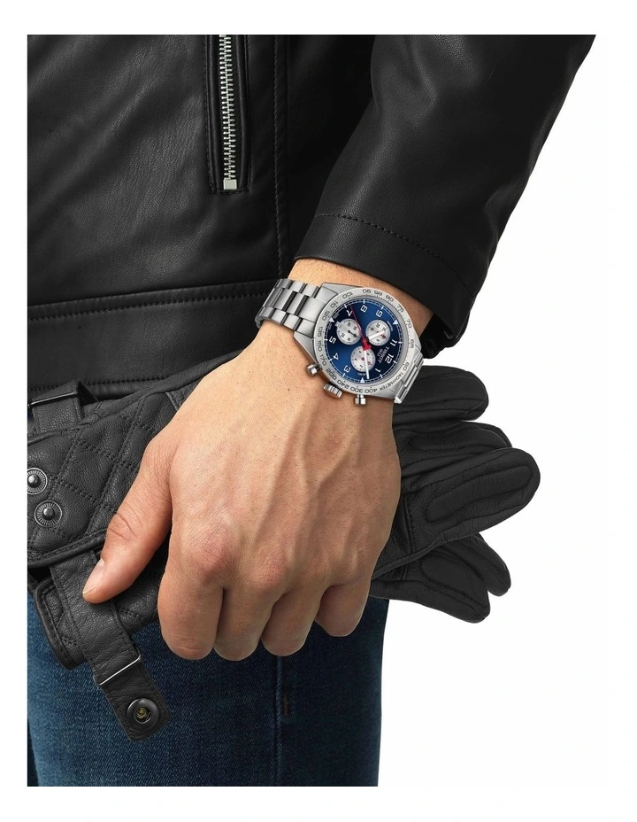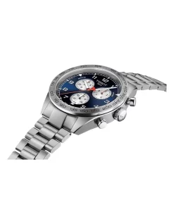 Designed to be precise, robust and sporty, this PRS 516 Chronograph is inspired by classic sports cars. A mens Swiss-made quartz watch with scratch-resistant sapphire crystal and tachymeter scale bezel. Features a blue dial and grey stainless steel bracelet.