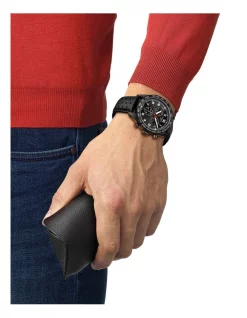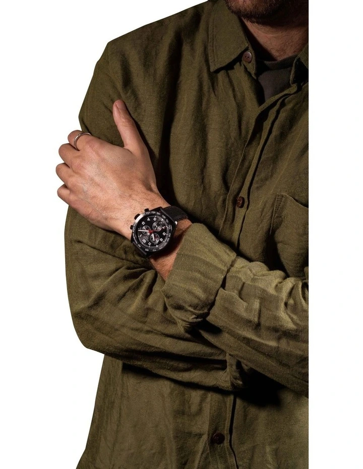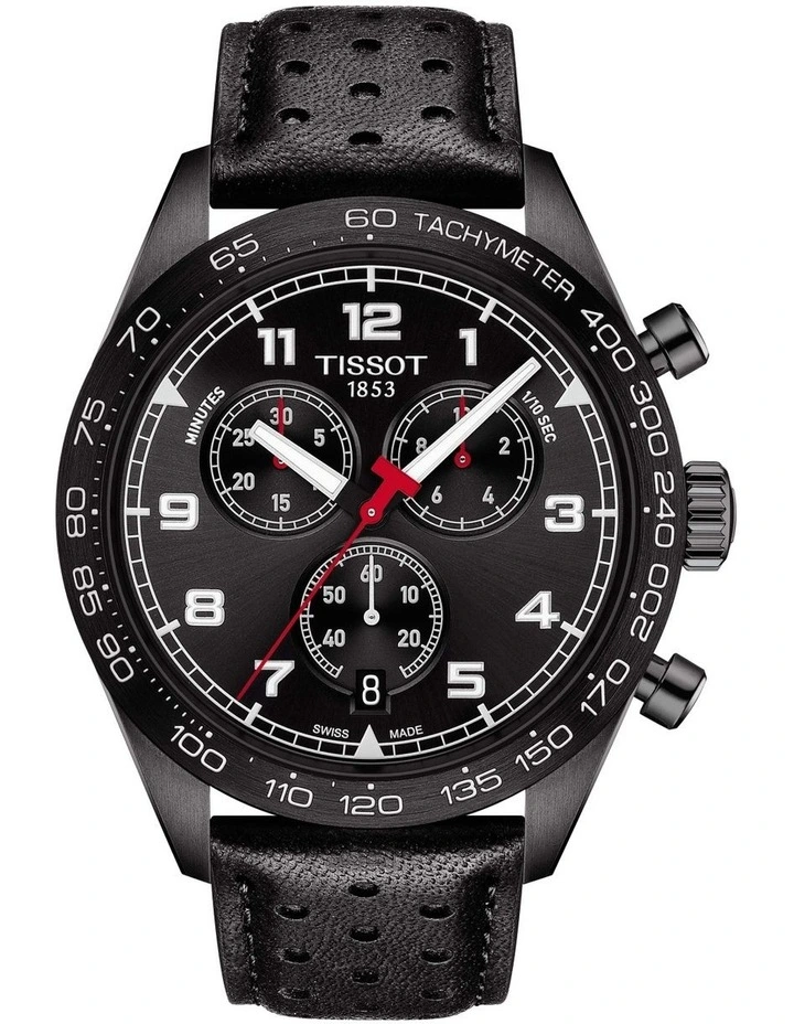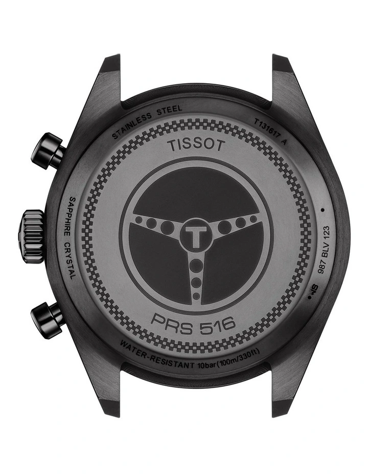 Designed to be precise, robust and sporty, this PRS 516 Chronograph is inspired by classic sports cars. A mens Swiss-made quartz watch with scratch-resistant sapphire crystal and tachymeter scale bezel. Features a black dial and black leather strap.