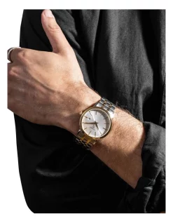 This men’s Swiss-made watch has a scratch-resistant sapphire crystal with antireflective coating, silver dial and stainless steel bracelet.